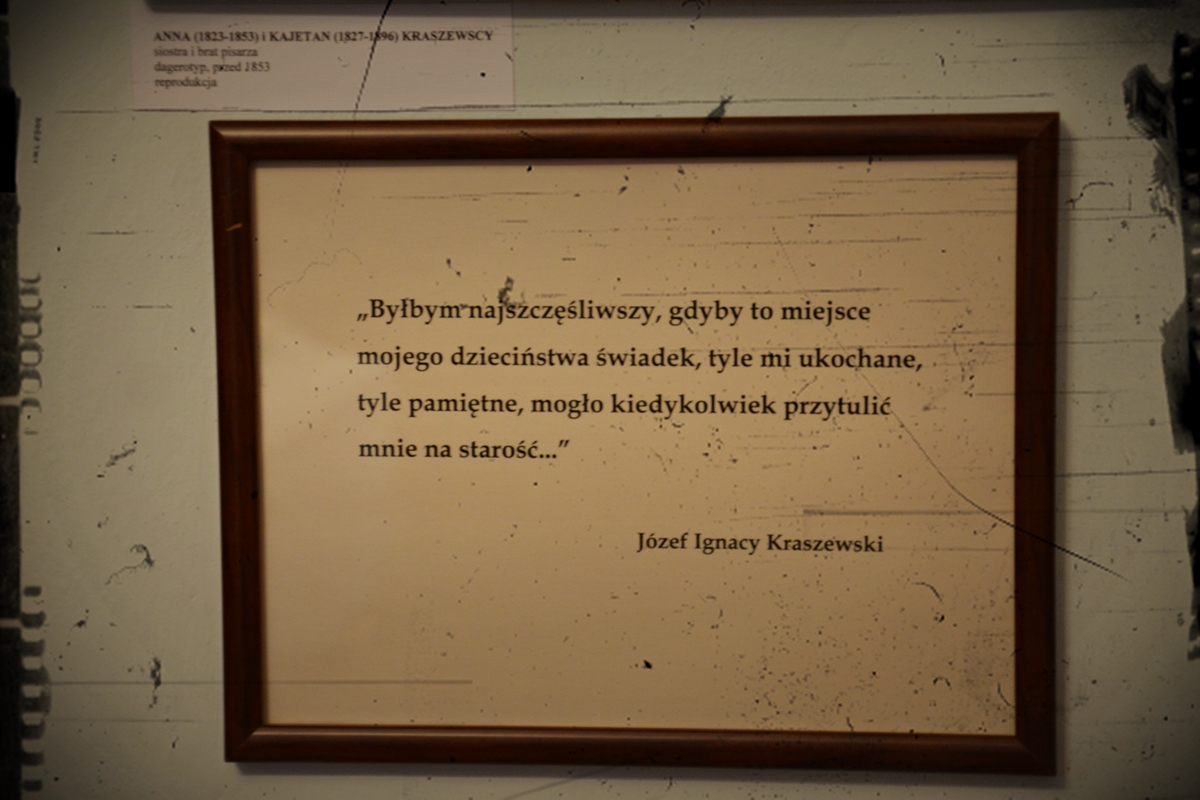 Na ścianach wiszą stare fotografie. Zdjęcie, które przykuło moją uwagę, przedstawia klasycystyczny dwór otoczony starymi drzewami. Przy bramie prowadzącej do niego stoi kilka osób. Może czekają na kogoś, a może po prostu korzystają z uroków ogrodu. Wyobraźnia podpowiada mi, że to były sielskie chwile. Dom powstał na początku XIX wieku, jednak ogród go otaczający jest dużo starszy. Tu właśnie wychowywał się pisarz i tu, pod czujnym okiem babki, zaczął zajmować się literaturą. Początkowo tłumaczył bajki z języka francuskiego, później sam zaczął pisać. W swoich utworach podejmował tematy romantyczne, jednak przekuwał je w formę stricte pozytywistyczną – prozę. Idylliczny Romanów w dużej mierze wpłynął na kształt jego twórczości. Przez całe życie pozostawał dla niego magiczną krainą lat dziecinnych, zupełnie tak jak Czarnolas dla Jana Kochanowskiego, a ziemia z Zaosiem i Nowogródkiem – dla Adama Mickiewicza. W „Pamiętnikach”, J.I. Kraszewski opisuje dwór jako miejsce idealne zarówno do odpoczynku, jak i do pracy. Zachwyca się zbudowaną nieopodal kaplicą, oranżerią czy ogrodem przypominającym gęsto zalesioną puszczę.