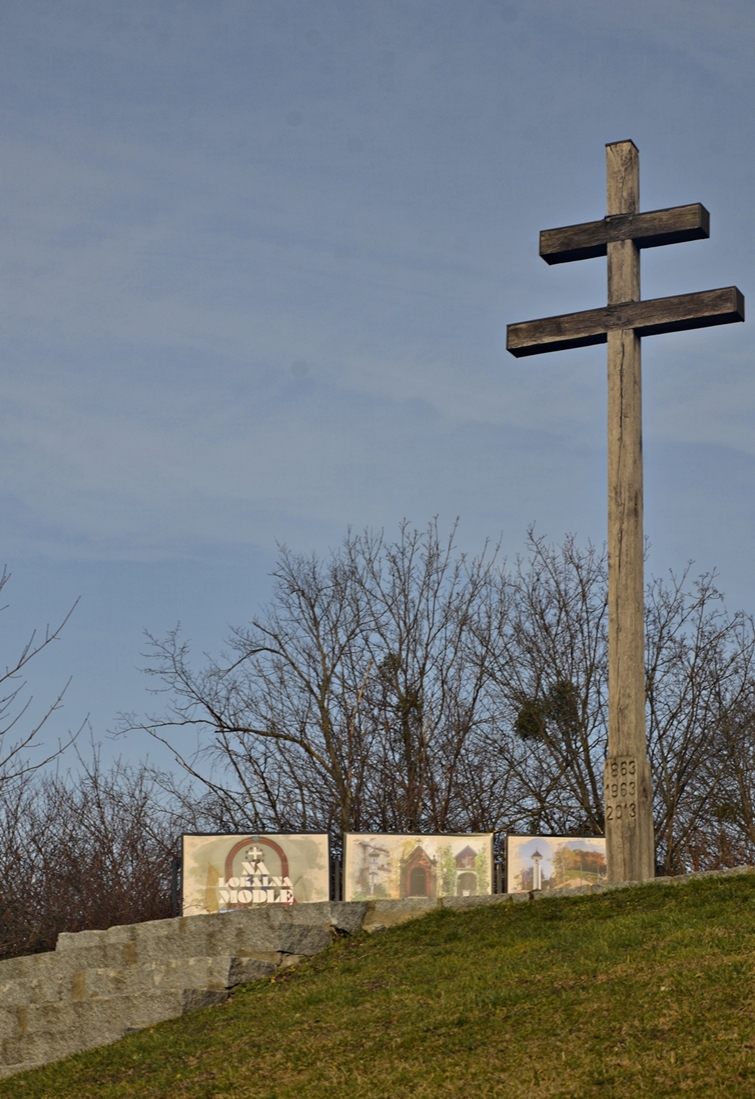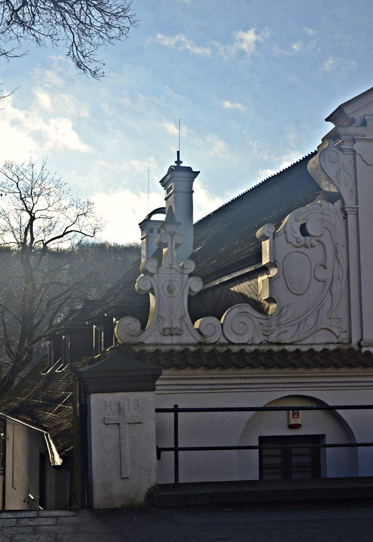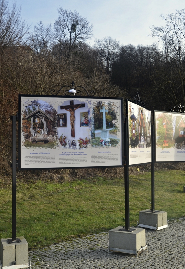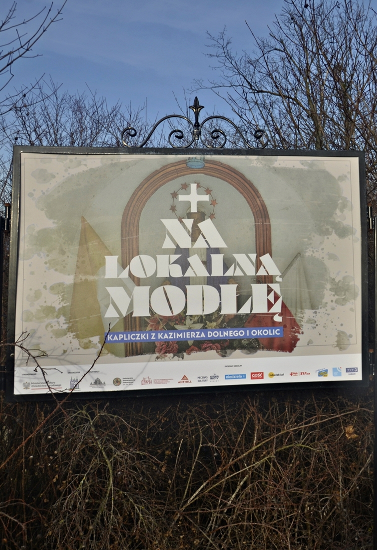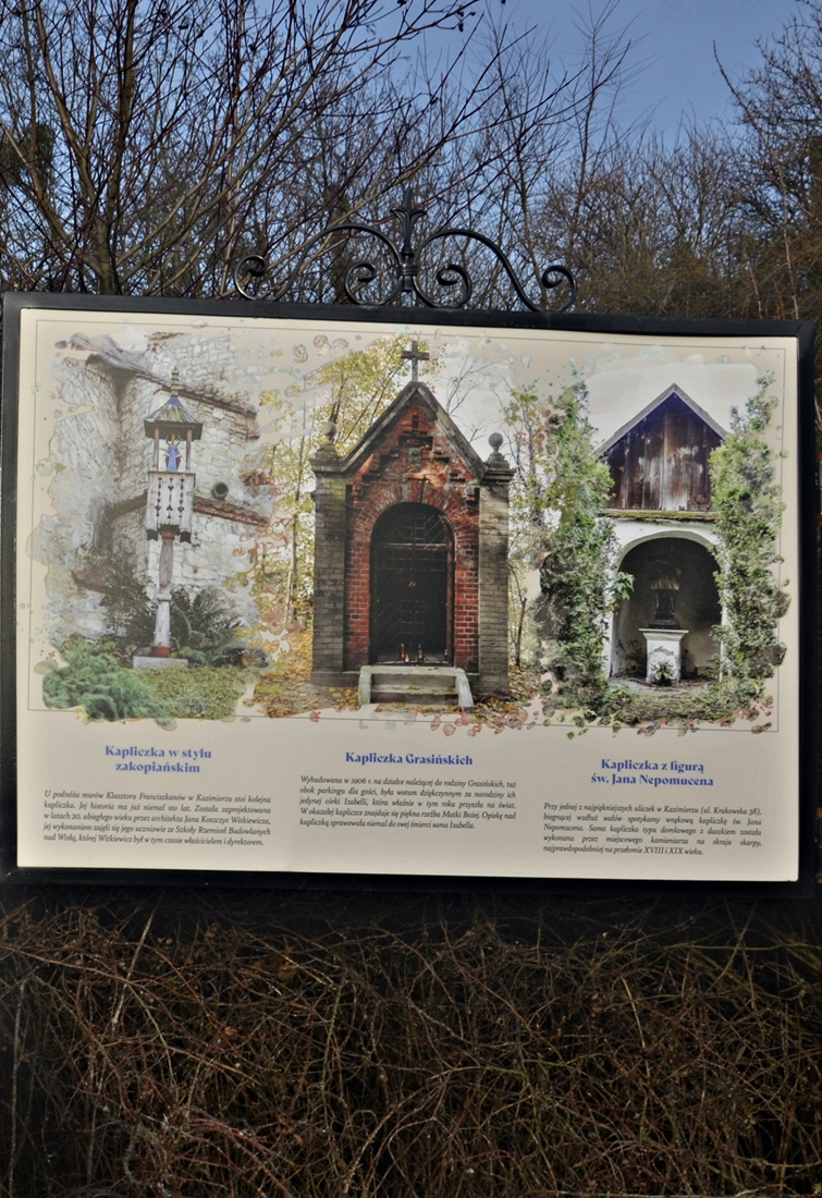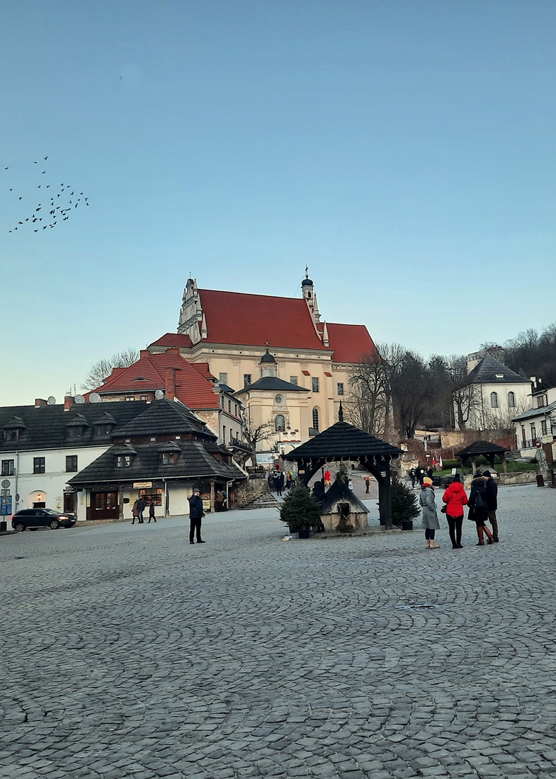 Tradycyjnie przyjechaliśmy do Kazimierza przed rozpoczęciem „doby hotelowej” w naszym pensjonacie:-). Poszliśmy więc na spacer. Za Farą, pomiędzy ulicami Puławską i Zamkową, znajduje się wzgórze zamkowe. Na jego zboczu jest między innymi stary cmentarz i krzyż 100-lecia powstania styczniowego. Gdy my byliśmy (grudzień 2023 r.), ustawiona była tam także wystawa prezentująca kapliczki z Kazimierza Dolnego i okolic. Uroczy krajobraz.