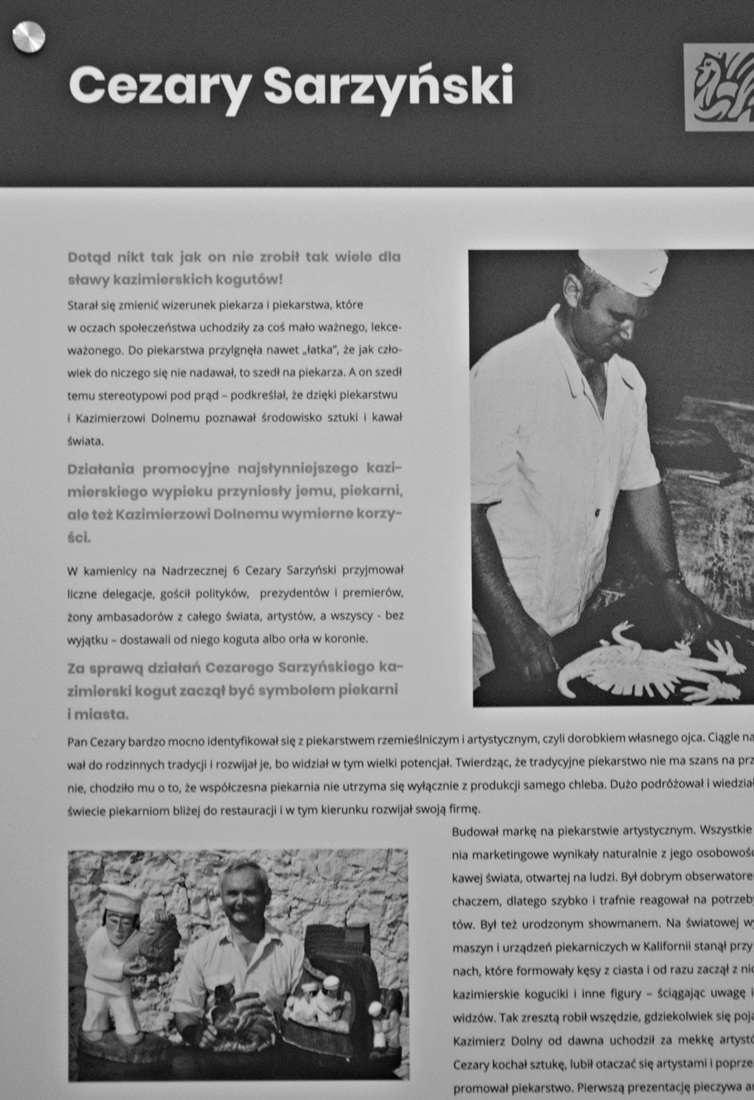 Nasz pobyt w muzeum zaczął się od filmu przedstawiającego legendę o sławetnym kogucie. Po krótkim seansie rzuciliśmy okiem na ekspozycję, obejmującą m.in. historię kazimierskiego młynarstwa i drobio...drożdżowego wypieku;-). Nie sposób w tym miejscu nie wspomnieć o Cezarym Sarzyńskim, który swoją markę zbudował na piekarstwie artystycznym. Dziś w rodzinnej piekarni Sarzyńskich kupimy nie tylko pyszne koguty i chleb, ale też inne jadalne wyroby rzemieślnicze, takie jak soki i czekolady.