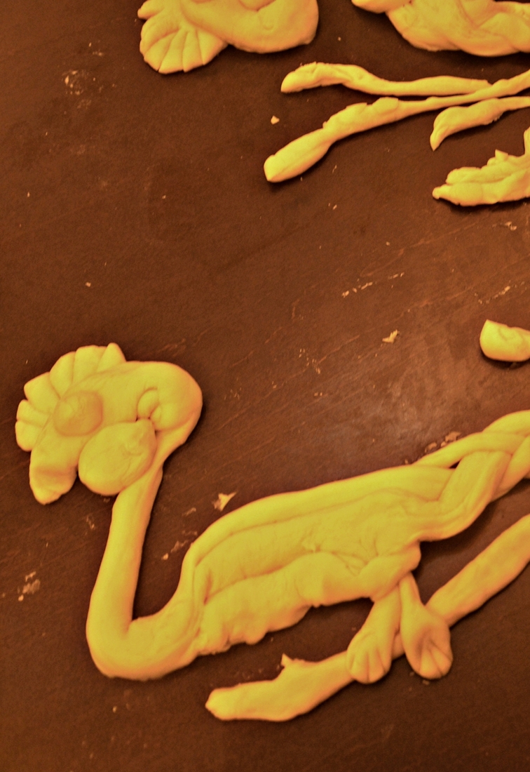 Uczestnicy warsztatów dostali po kuli drożdżowo-maślanego ciasta. Następnie, z pomocą pani instruktor, na wielkim stole powstało kilkanaście mniej lub bardziej koślawych kogutów:-) Cóż, by stworzyć takiego pięknego jak z piekarni, potrzeba sporo wprawy (potem robi się go już w dwie minuty!). Jednak najważniejszy jest smak – kogut od Sarzyńskich jest tak dobry, że nie sposób było dowieźć go z Kazimierza do Warszawy – został zjedzony po drodze.