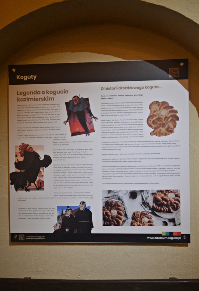 Legendę o kazimierskim kogucie poznaliśmy w istniejącym od 2021 roku Muzeum Koguta i Kazimierskich Tradycji Kulinarnych. Miejsce to znajduje się w kamienicy z piekarnią rodziny Sarzyńskich, w zabytkowych 17-wiecznych piwnicach. Główną atrakcją muzeum są niewątpliwie warsztaty wyplatania drożdżowego koguta – zabawa dobra zarówno dla dzieci, jak i dorosłych.
