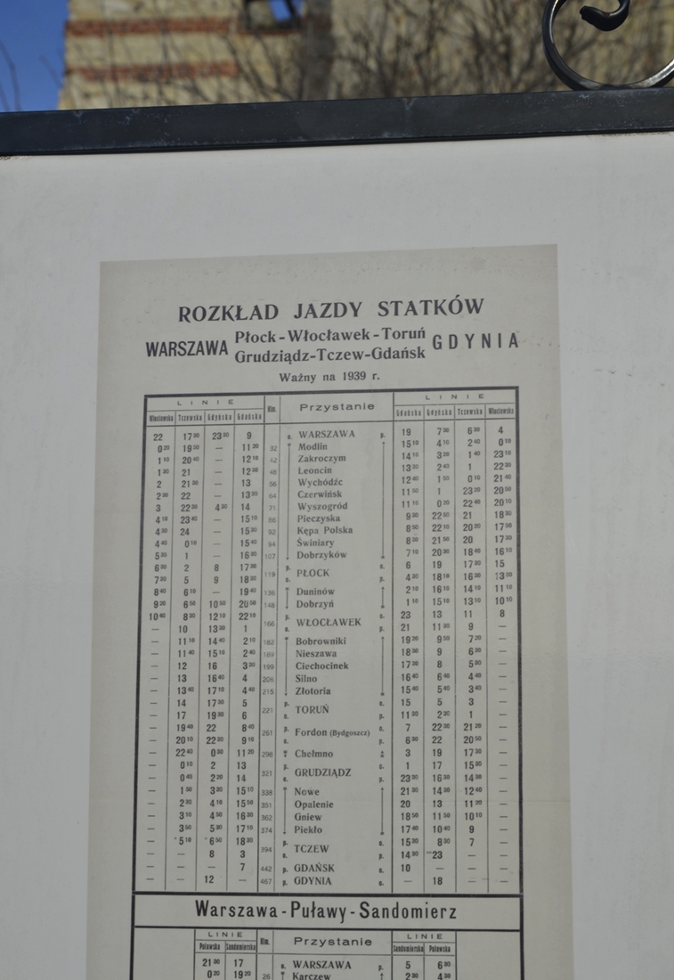 Zaciekawiła nas także tablica z przedwojennym rozkładem jazdy statków pływających na trasie Warszawa-Gdynia (to musiała być podróż!) i Warszawa-Puławy-Sandomierz. Po drodze mijało się właśnie Kazimierz. W granatowo-mlecznej wodzie odbijały się stare spichlerze i kamieniczki, a po drugiej stronie – mury janowskiego zamku. Najpiękniej było przemierzać ten odcinek o zachodzie słońca. Przynajmniej tak to sobie wyobrażam…:-).