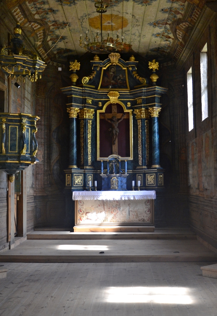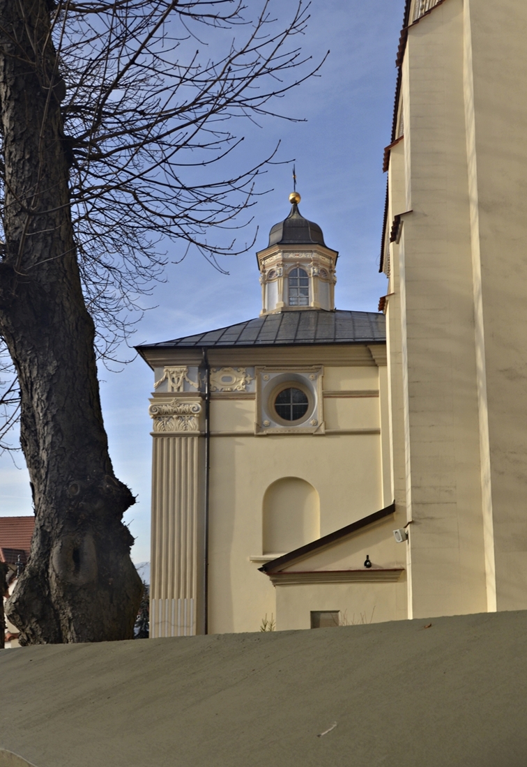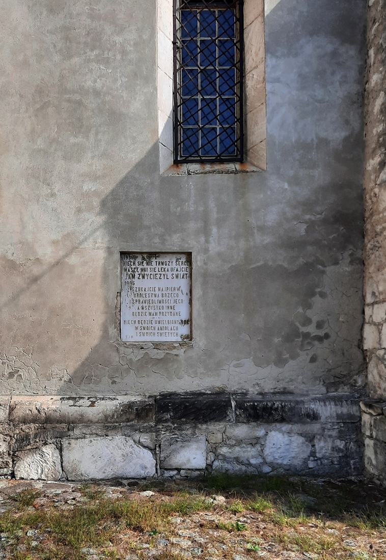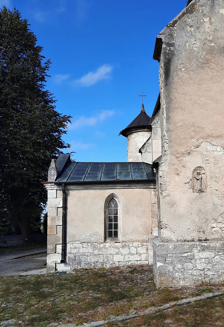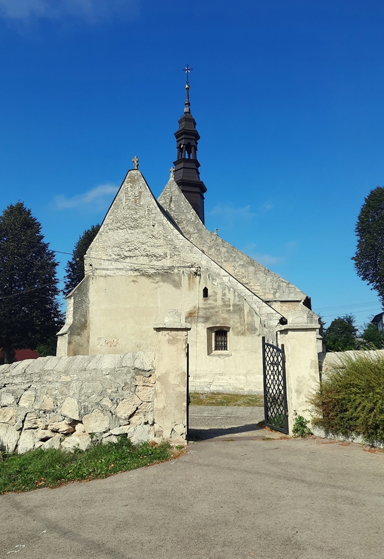 Kościół wyróżnia okrągła baszta ze stożkowym daszkiem. Na elewacji znajdują się resztki dawnych gotyckich inskrypcji – patrząc na nie, można na chwilę przenieść się w czasie;-) Takie inskrypcje rzadko zdobiły zewnętrzne ściany świątyń, dlatego tym bardziej dobrze zwrócić na nie uwagę. Do wnętrza prowadzi gotycko-renesansowy portal.