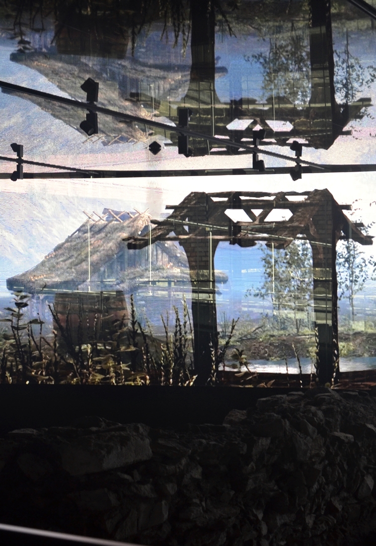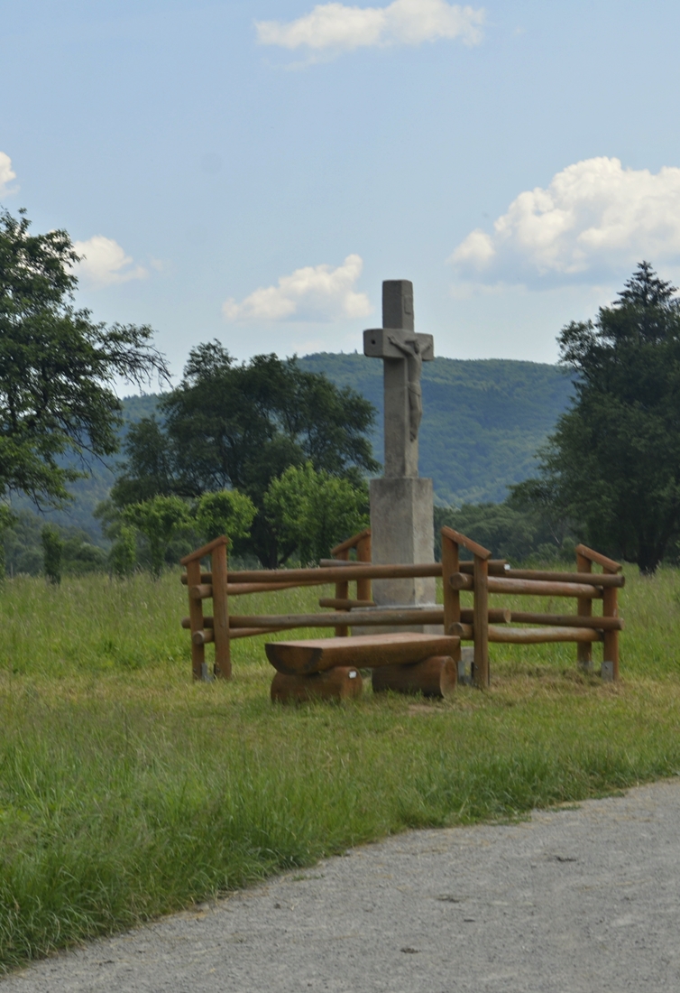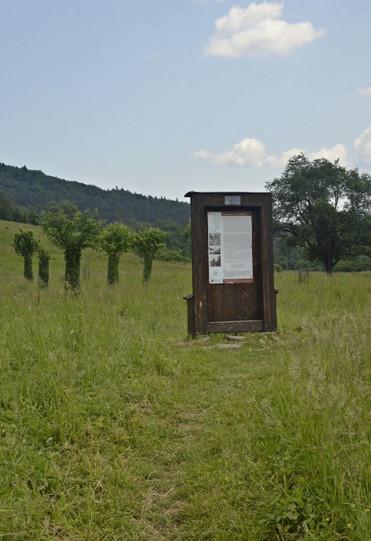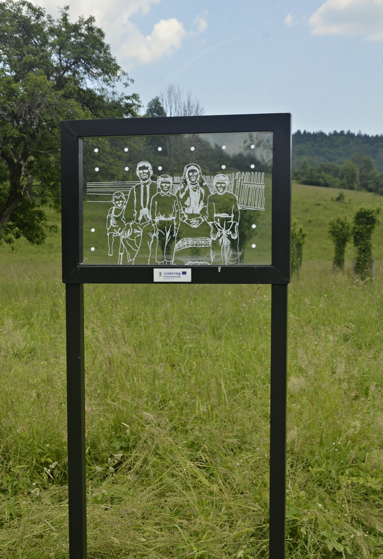 Pokonaliśmy ostatni bród i doszliśmy do rozległej łąki, gdzie stoją symboliczne drzwi do łemkowskiej chaty – instalacja autorstwa Natalii Hładyk. Ostatnio na łące pojawiła się także rekonstrukcja studni i tablice z rysunkami na szkle, przedstawiające łemkowską rodzinę i chyżę. Przepiękne to. Idąc dalej, doszlibyśmy do starego cmentarza i cerkwiska, a w końcu – do wsi Wołowiec. Kiedyś szliśmy do Nieznajowej właśnie od Wołowca – przeczytasz o tym tutaj.
