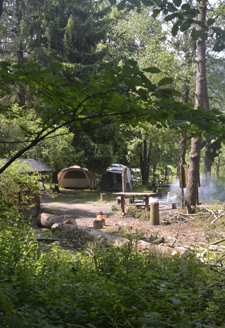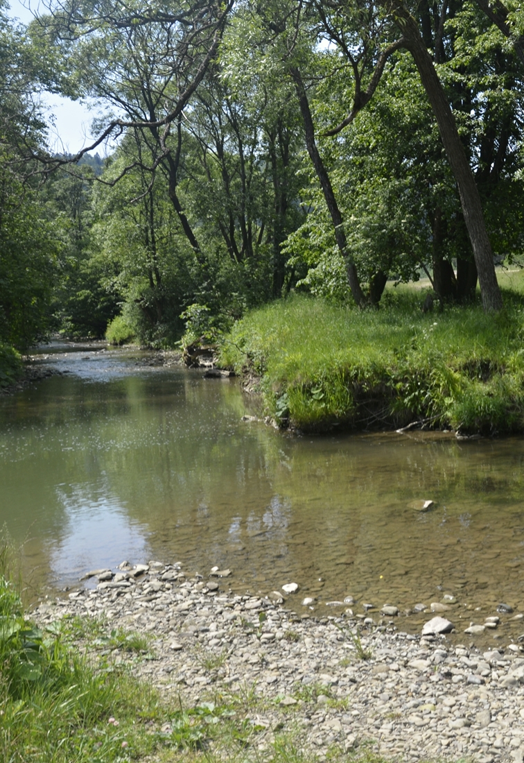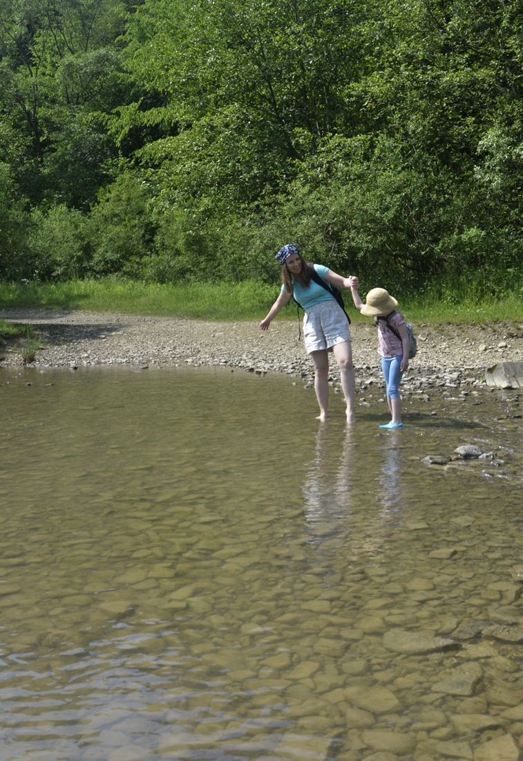 Zaraz po pokonaniu pierwszego brodu (dopływ Wisłoki) rozpoczyna się teren Magurskiego Parku Narodowego – bilety kupiliśmy przez internet. Nie ma kas, nawet w sezonie nie spotkamy na tej trasie wielu turystów. Mamy do pokonania około 2,5 km w jedną stronę, żółtym szlakiem. Otaczająca nas przyroda jest cudowna – słyszymy trzmiele, żaby i ptaki w koronach drzew. Przez chwilę szliśmy nawet śladami czapli:-). W końcu dotarliśmy do miejsca, gdzie Wisłoka łączy się z potokiem Zawoja. Jest pięknie.