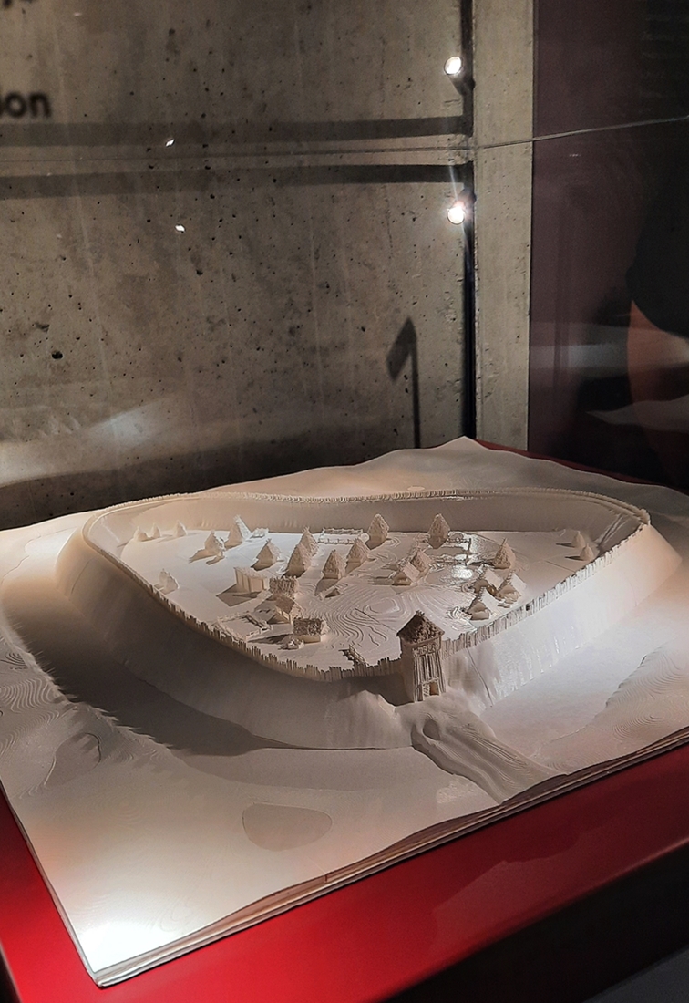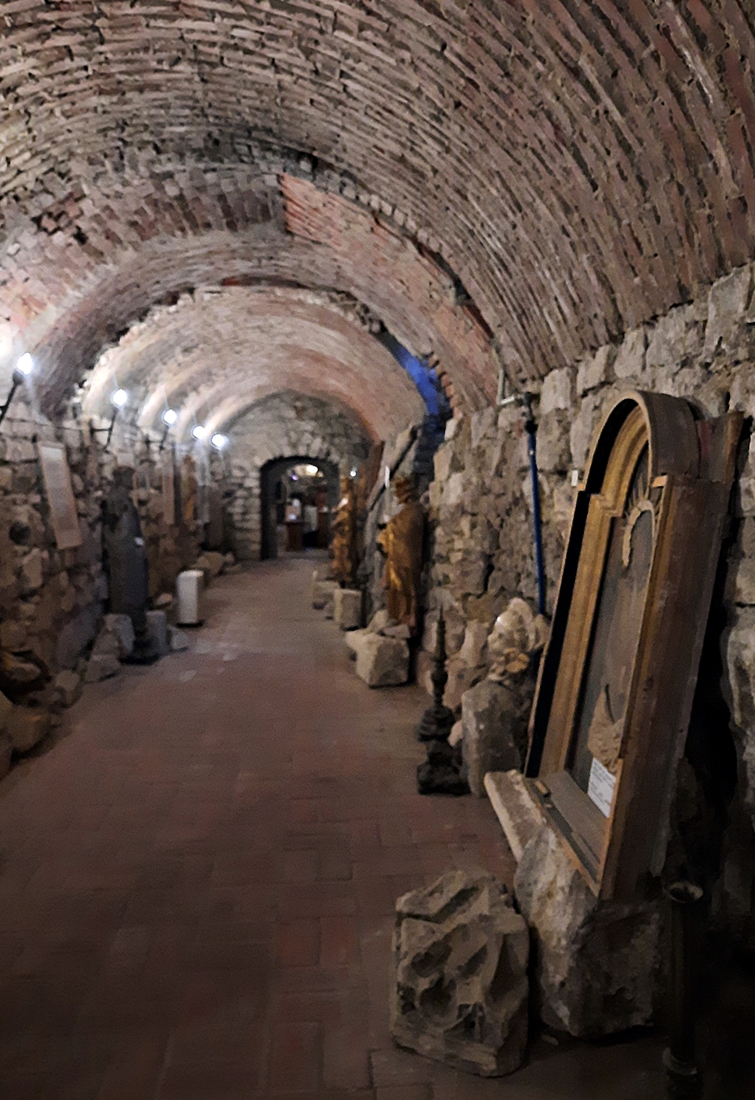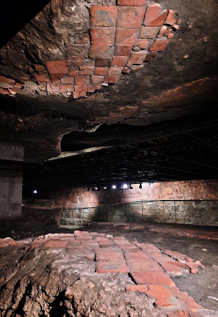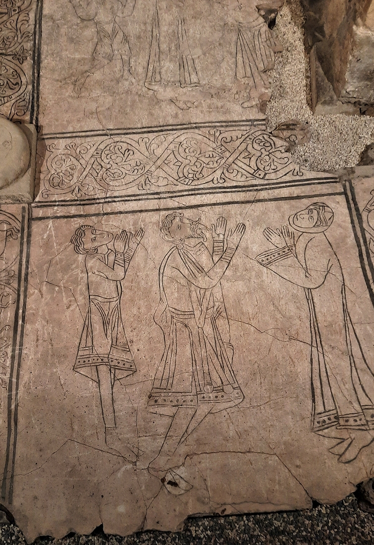 Tego wszystkiego dowiemy się zaglądając do Muzeum Archeologicznego w Wiślicy. Jego siedzibą jest nowoczesny pawilon zlokalizowany u podnóża kolegiaty. Zwiedzanie rozpoczęliśmy od obejrzenia filmu prezentującego powstanie wiślickiego grodu. Muzealny pawilon przykrywa relikty pięknego, wczesnoromańskiego kościoła św. Mikołaja, natomiast kolejne sale to swoisty rezerwat archeologiczny, ulokowany w podziemiach sąsiedniej Bazyliki. Ten niesamowity labirynt odsłania przed nami pozostałości dwóch kolejnych świątyń romańskich. Jednym z najcenniejszych zachowanych elementów jest rytowana posadzka krypty, zwana Płytą Orantów (zdjęcie 1). Z kolei w podziemnym korytarzu znajduje się ekspozycja drobnych przedmiotów (monety, narzędzia, itd.), znalezionych w najbliższej okolicy kolegiaty.