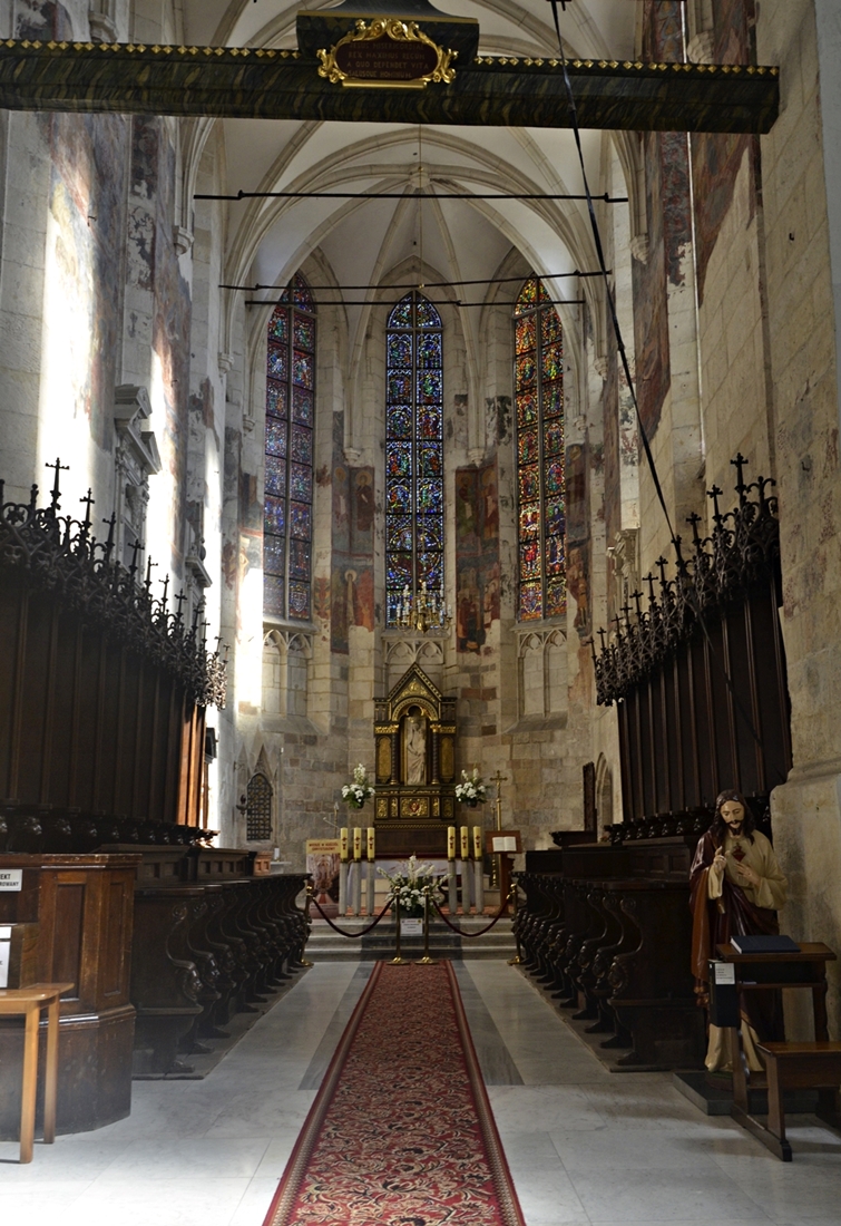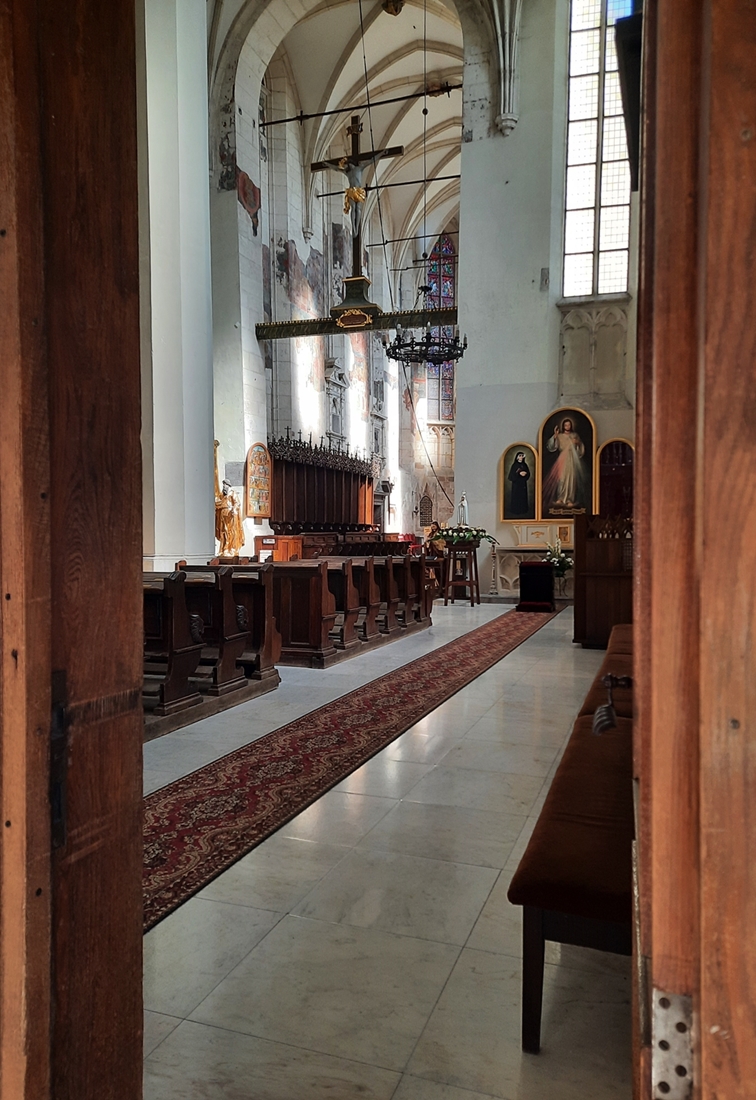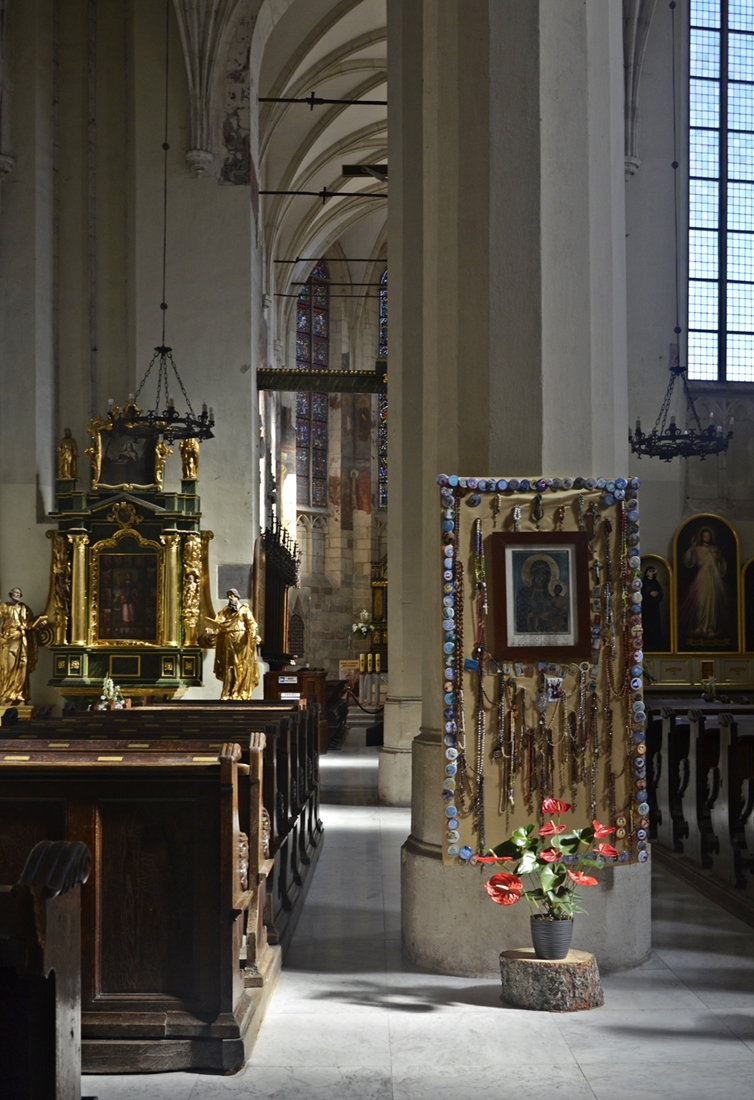Wnętrze świątyni robi wrażenie – przepiękne sklepienie, fragmenty starych fresków, witraże w oknach, okazałe stalle. Ołtarz ozdabia posąg Madonny Łokietkowej, który datuje się na 1300 rok! Miejscowa tradycja podaje, że modlił się przed nim o zjednoczenie ziem polskich król Władysław Łokietek. W kościele znajduje się także gotyckie sakramentarium, na ścianach wiszą liczne epitafia, a na sklepieniu widoczne są herby ziem, które weszły w skład odrodzonego Królestwa Polskiego. Meandry historii.