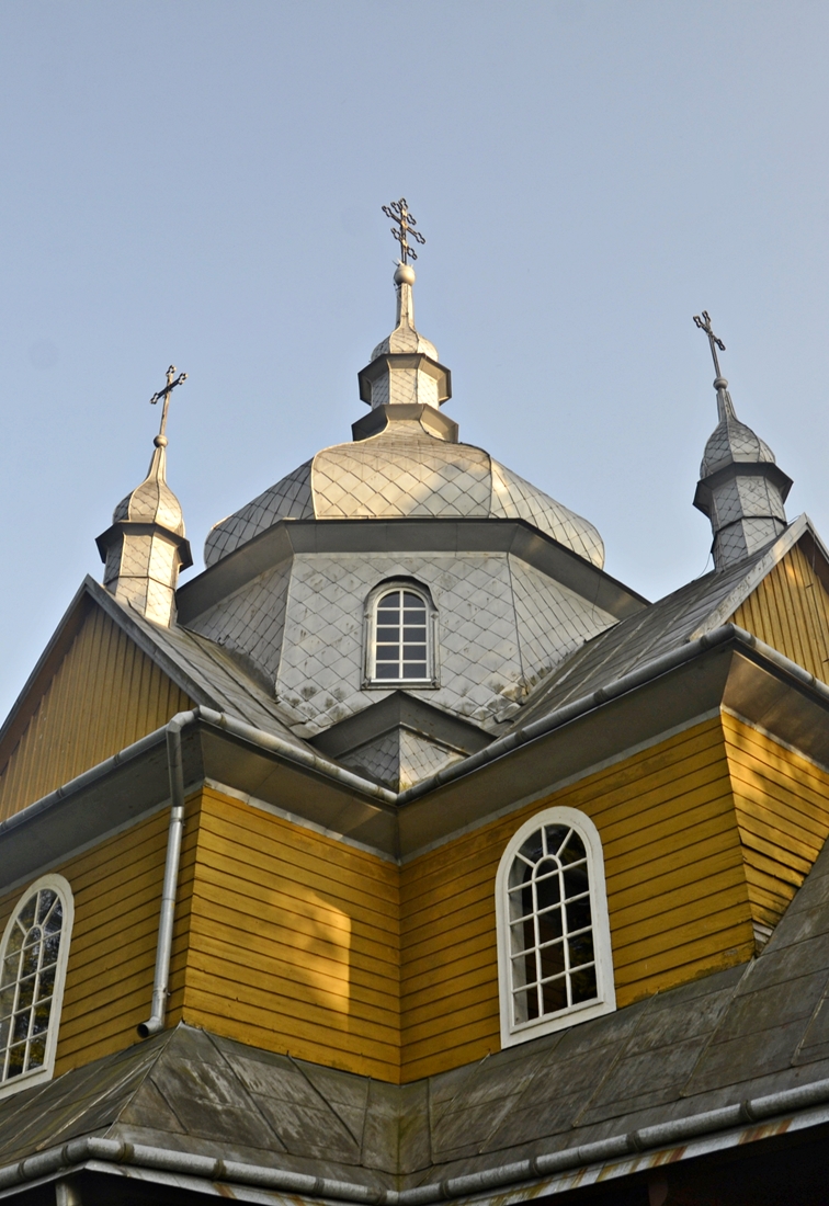 Wracamy do Gładyszowa. Są tu dwie cerkwie – prawosławna (Narodzenia św. Jana Chrzciciela) i grekokatolicka (Wniebowstąpienia Pańskiego). Ta druga (zdjęcia 1-3) została wybudowana pod koniec lat 30. przez huculskich cieśli. Już na pierwszy rzut oka widać, jak bardzo jej bryła różni się od większości cerkwi zachodniej i środkowej Łemkowszczyzny – została wzniesiona na planie krzyża greckiego, na wzór tzw. ukraińskiego stylu narodowego (który pojawił się na tych terenach w okresie międzywojnia). W jej architekturze dominuje centralna kopuła nakrywająca nawę i brak jest wież.