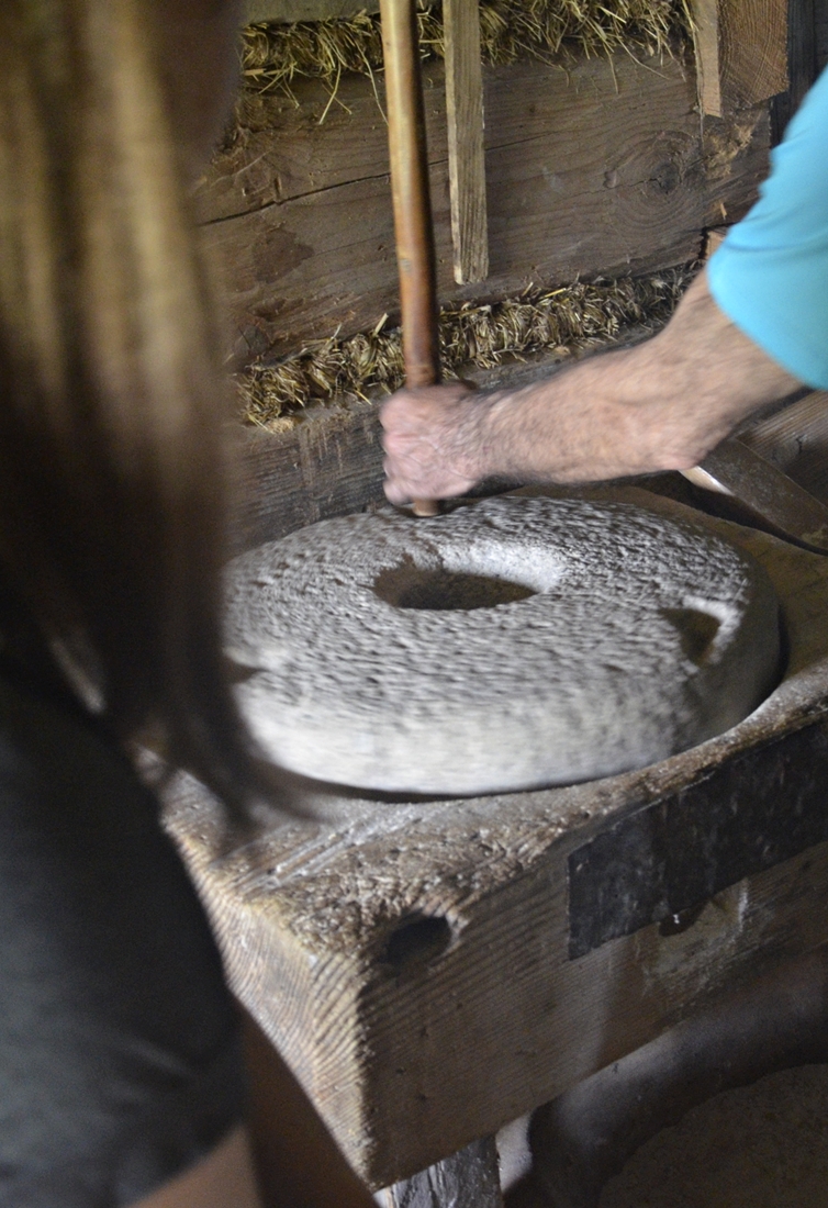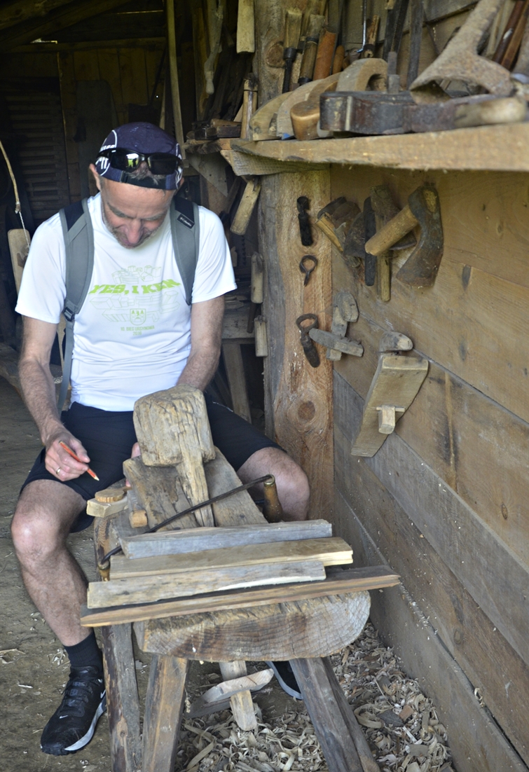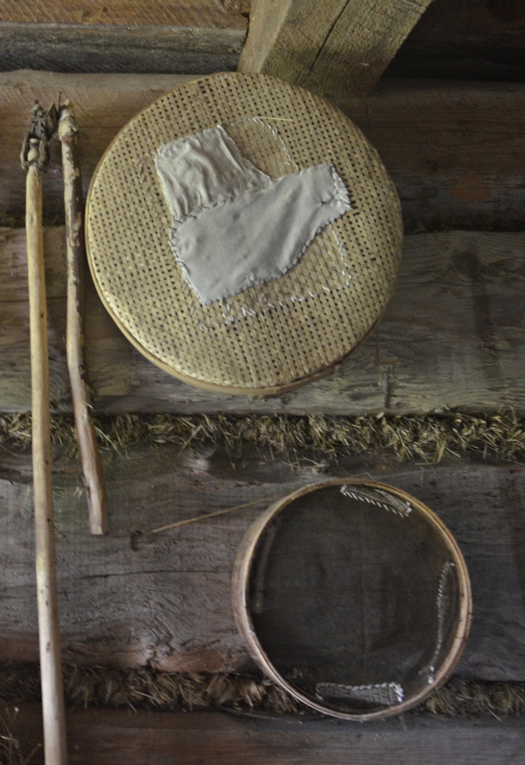 Centralnym budynkiem zagrody jest zabytkowa chyża z 1922 roku, przeniesiona z pobliskiej wsi Smerekowiec. W głównej izbie zobaczymy różne przedmioty codziennego użytku, stary gliniany piec, ławy, a także łemkowską odzież. W komorze stoi m.in. sprzęt do obróbki lnu i warsztat tkacki. Częścią budynku jest także stajnia (Łemkowie mieszkali ze zwierzętami pod jednym dachem) i wozownia, gdzie stoi warsztat stolarski. W chyży mieliśmy okazję spróbować ubić masło w drewnianej maselnicy, wydobywaliśmy włókna z łodyg lnu i mieliliśmy mąkę w żarnach. Dodatkowo M. próbował swoich sił w wyrabianiu drewnianej łyżki i gontu, ale, mimo cennych wskazówek gospodarza, nie było to proste:-).