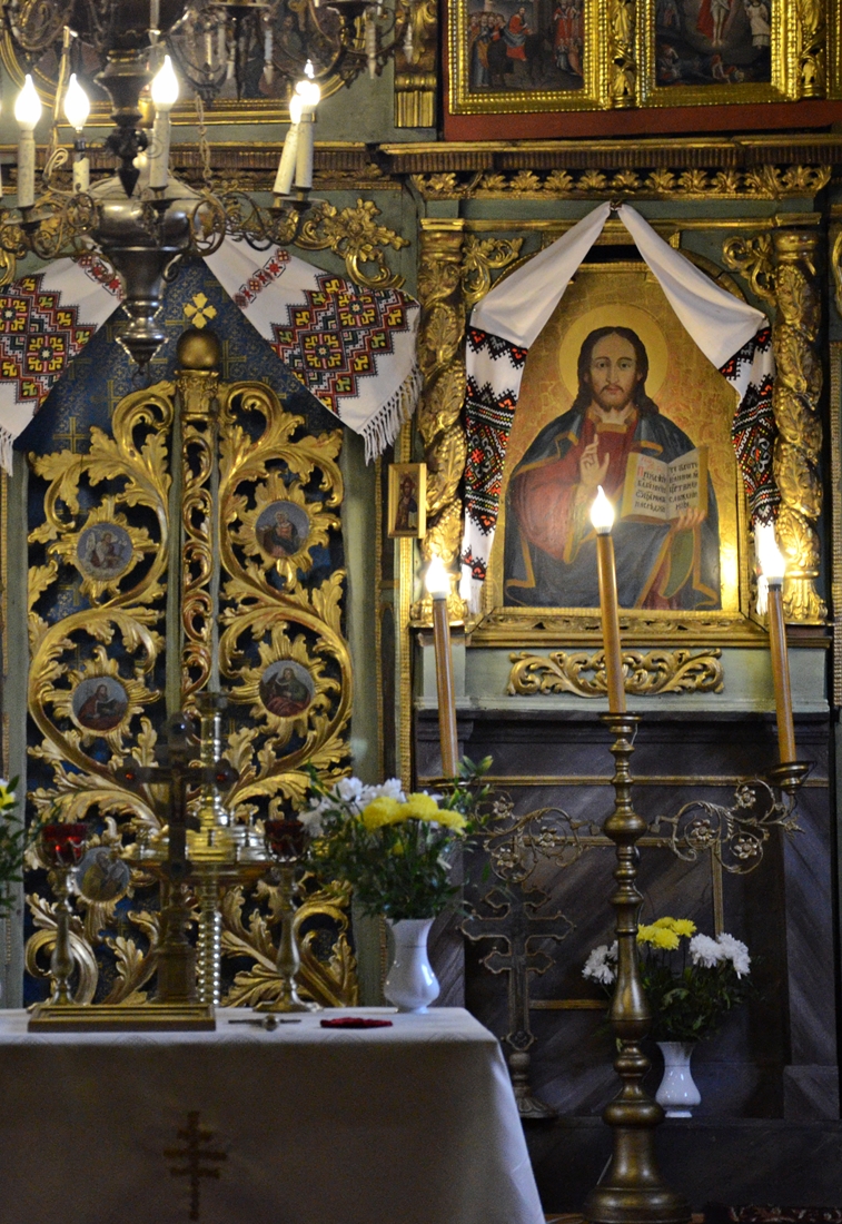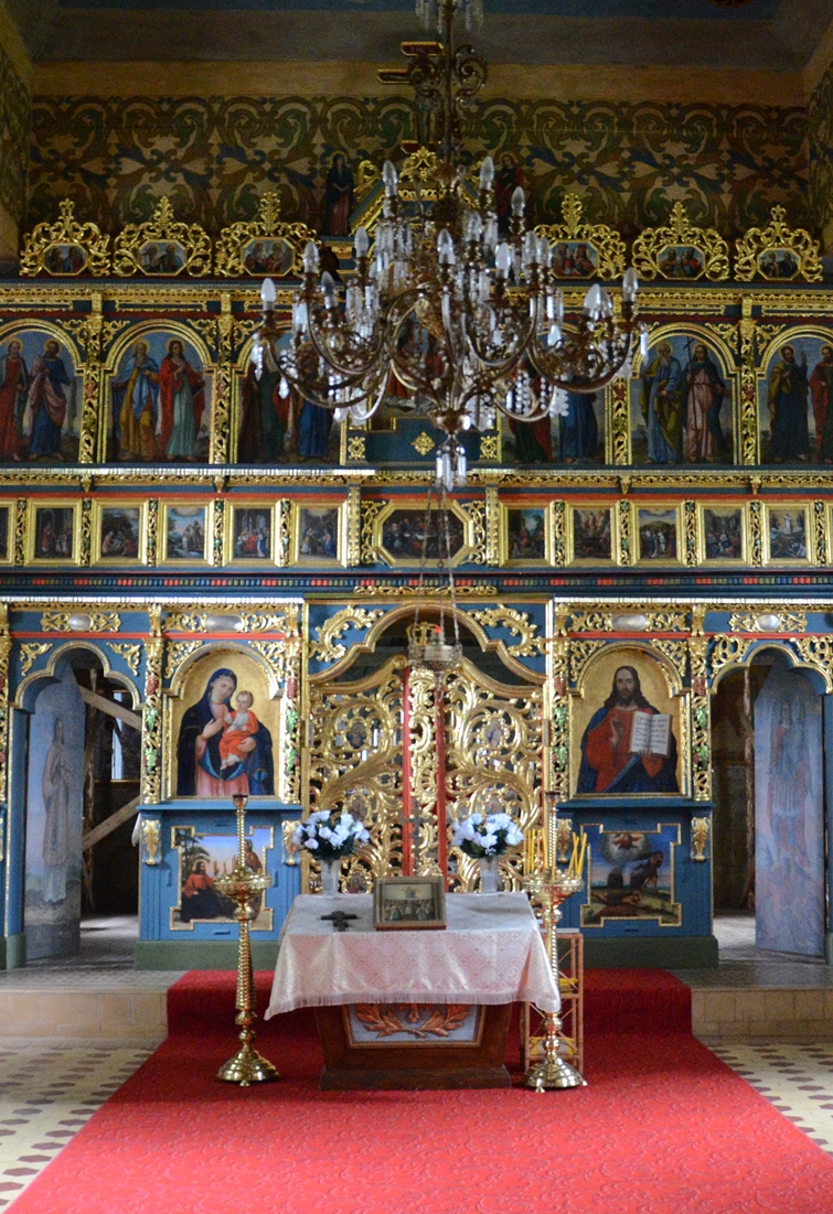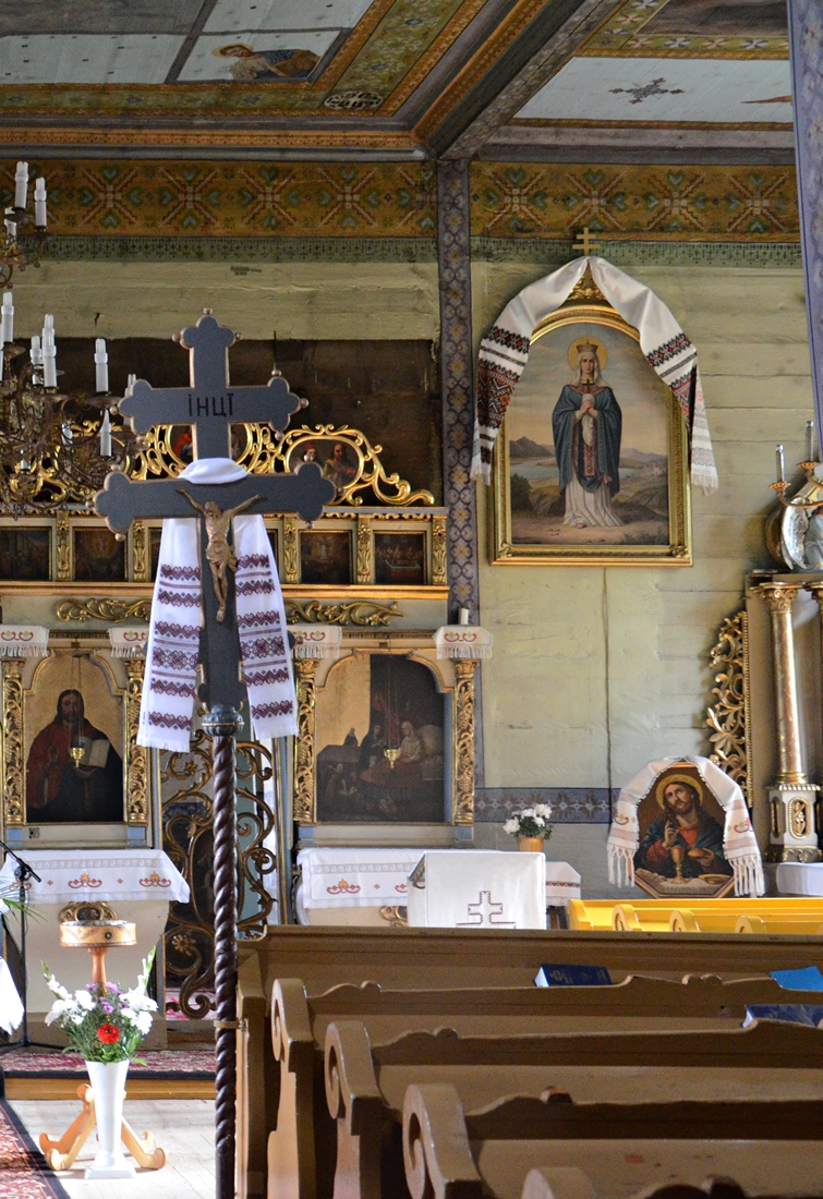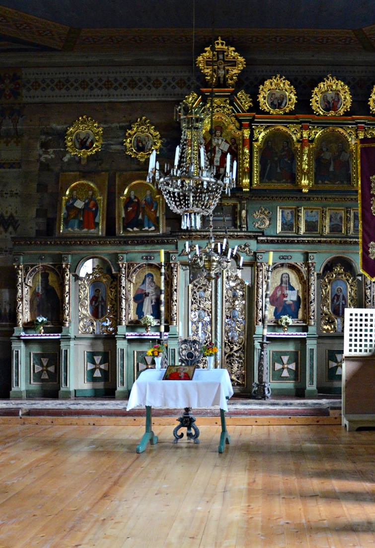 Jak już pisałam, łemkowskie cerkwie są trójdzielne, a każda część świątyni spełnia inną funkcję. Gdy tylko mijamy próg cerkwi, wchodzimy do babińca – pomieszczenia przeznaczonego dawniej dla kobiet. Dalej przechodzi się do nawy, gdzie podczas nabożeństw gromadzili się mężczyźni. Naprzeciw umieszczony jest ikonostas, za którym znajduje się prezbiterium. To sfera sacrum, gdzie mogą przebywać jedynie kapłani odprawiający nabożeństwo*. Ikonostas zawsze najbardziej przykuwa uwagę:-). To drewniana ściana wypełniona ikonami ustawionymi w kilku rzędach. W centralnej części ikonostasu znajdują się przejścia, spośród których największe nazywane jest Carskimi Wrotami.