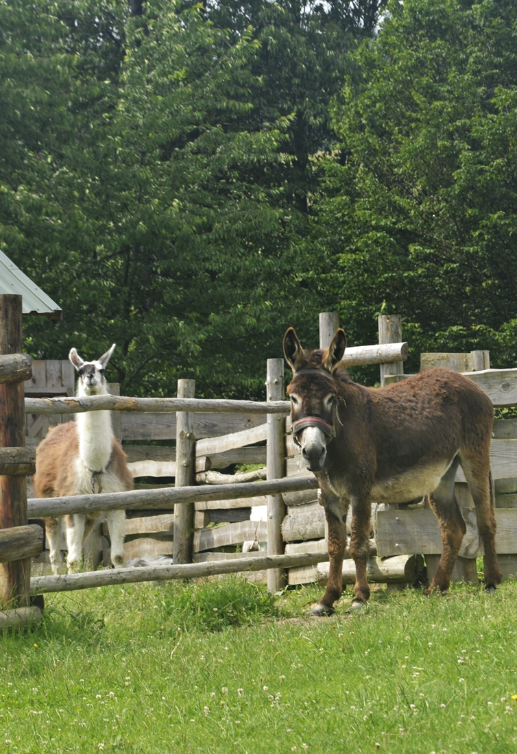 W mini-zoo zobaczymy między innymi kangura, alpaki, daniele, krowy odmiany „Highland” (zwykłe też;-)) albo owce kameruńskie, które wyglądają jak kozy. Jest też paw, bażant, struś emu, króliki, osiołek. A także mnóstwo pięknych beskidzkich przestrzeni. Na końcu pętelki jest plac zabaw z dużym misiem, wiata grillowa i sklepik z pamiątkami. Jakby ktoś chciał wziąć lamę do domu :-).