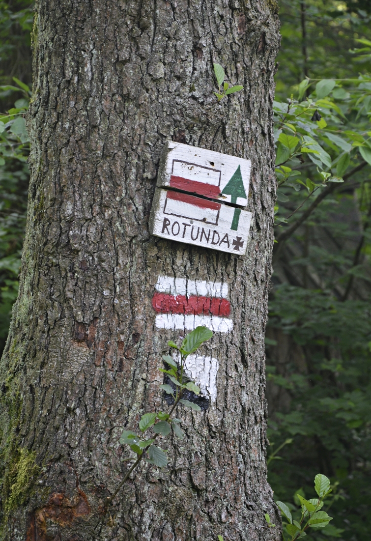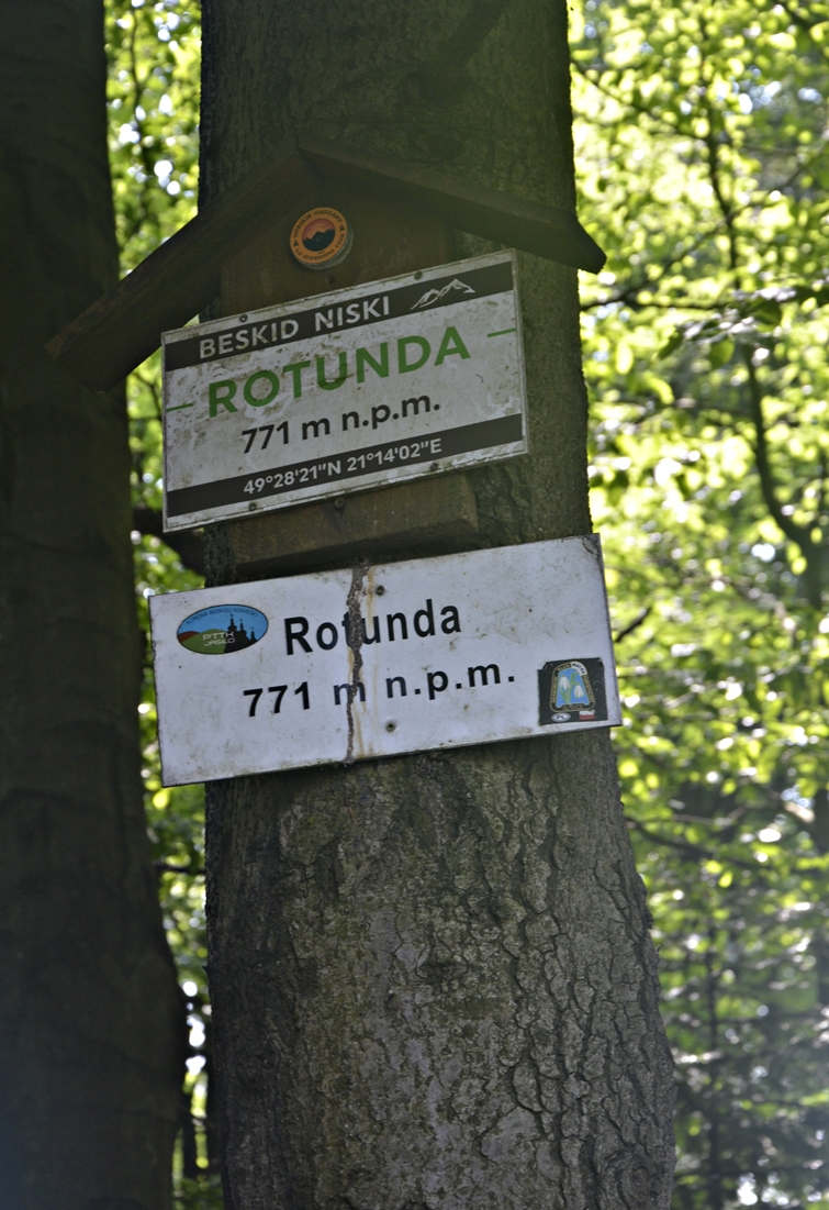 Cmentarz był przez dziesięciolecia zapomniany i niszczał, a z pierwotnych wież niewiele zostało. Rekonstrukcja odbyła się dzięki staraniom członków Studenckiego Koła Przewodników Beskidzkich z Warszawy, które prowadzi letnią bazę namiotową w Regietowie. Swoją drogą – niesamowite to miejsce:) Na Rotundę (771 m n.p.m.) wyruszyliśmy właśnie z Regietowa – to wieś niedaleko Gładyszowa. Nasz szlak (czerwony) rozpoczyna się w pobliżu wspomnianej bazy. Do przejścia mamy około 2 km jedną stronę, trasa jest zalesiona. Trzeba pokonać spore przewyższenie.