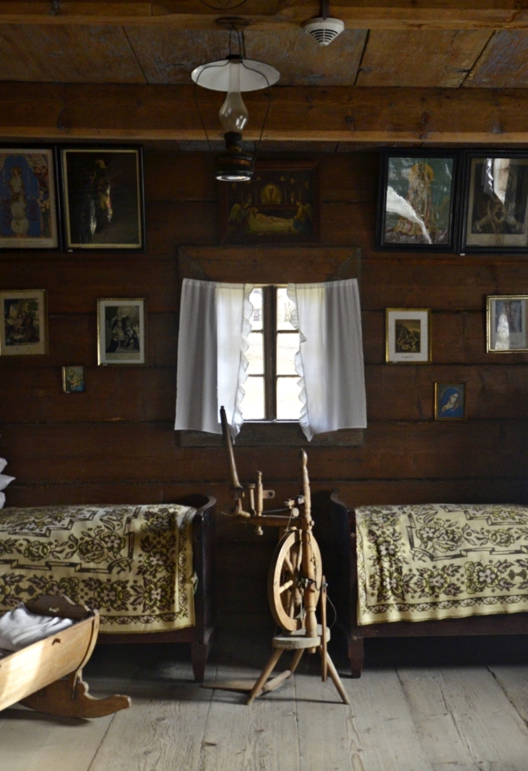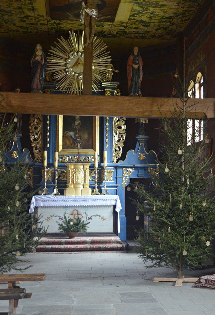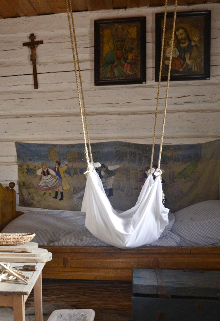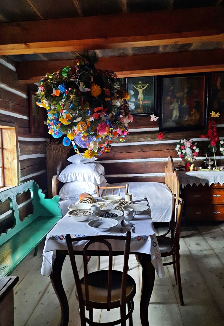 Jesteśmy już co prawda poza okresem Bożonarodzeniowym, ale w skansenie w Wygiezłowie byliśmy tuż po Świętach. W związku z tym mogliśmy podejrzeć dawne zwyczaje Krakowiaków Zachodnich związane właśnie z tym czasem. W jednej z chałup nad stołem wisiała bogato zdobiona podłaźniczka, natomiast brak było klasycznej choinki. Czym jest podłaźniczka? To ucięty i odwrócony „do góry nogami” wierzchołek choinki (sosny, jodły lub świerku), który podczas Świąt Bożego Narodzenia wieszano najczęściej właśnie nad stołem. Gałązki ozdabiano szczodrze – kolorowymi wycinankami, kulkami z bibuły, słomą, jabłkami, orzechami. Czym więcej, tym lepiej;-).