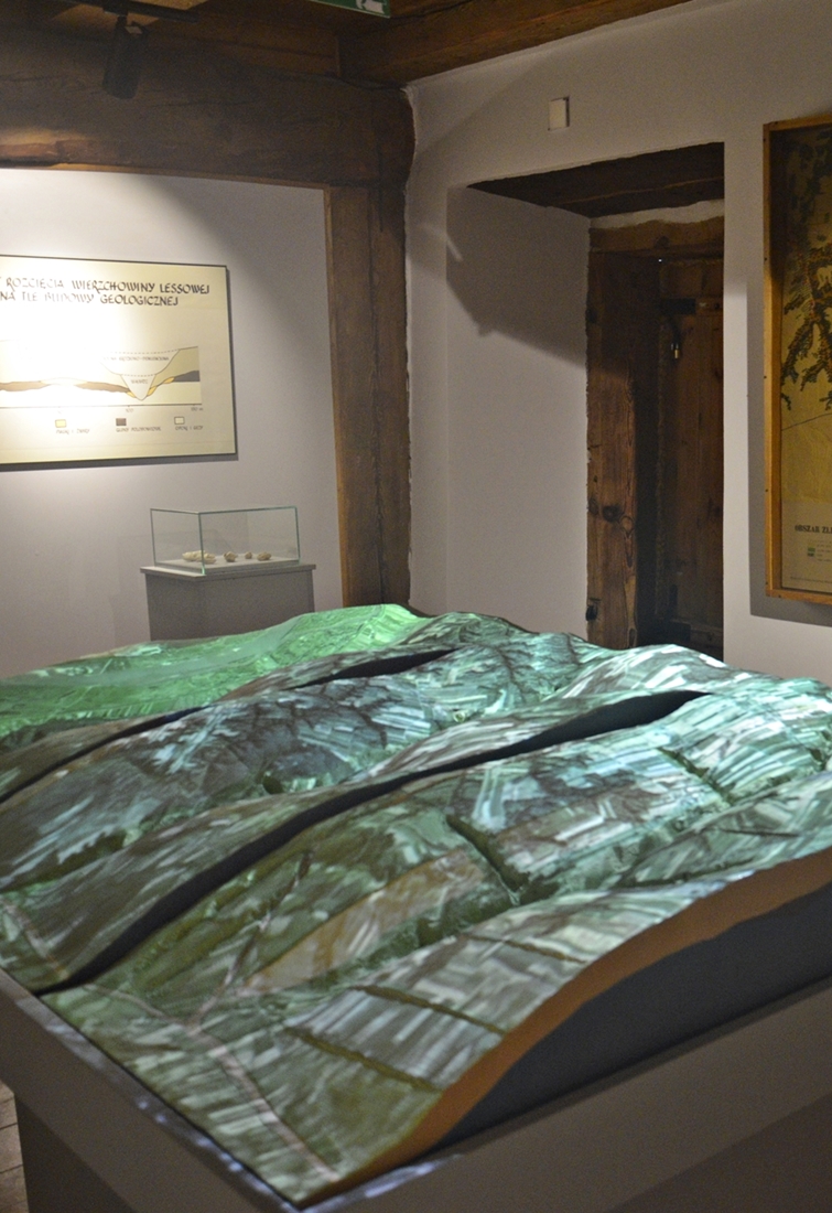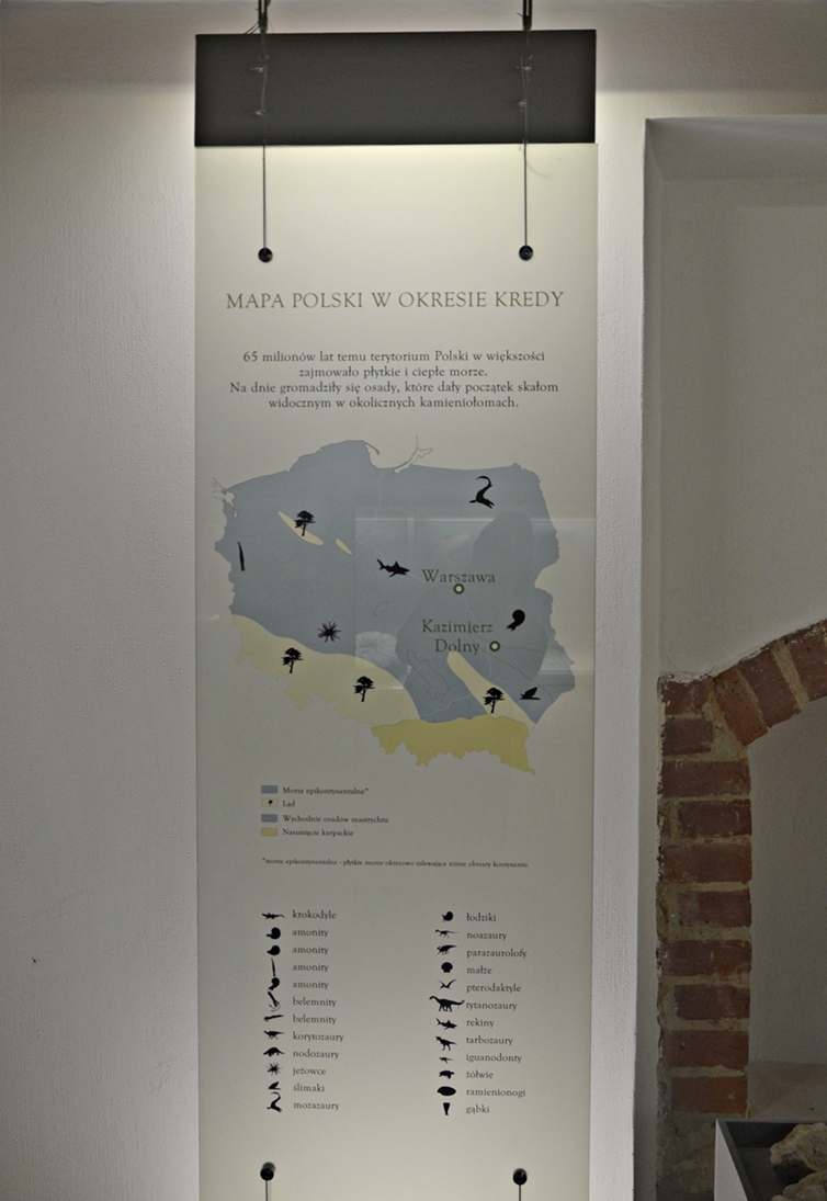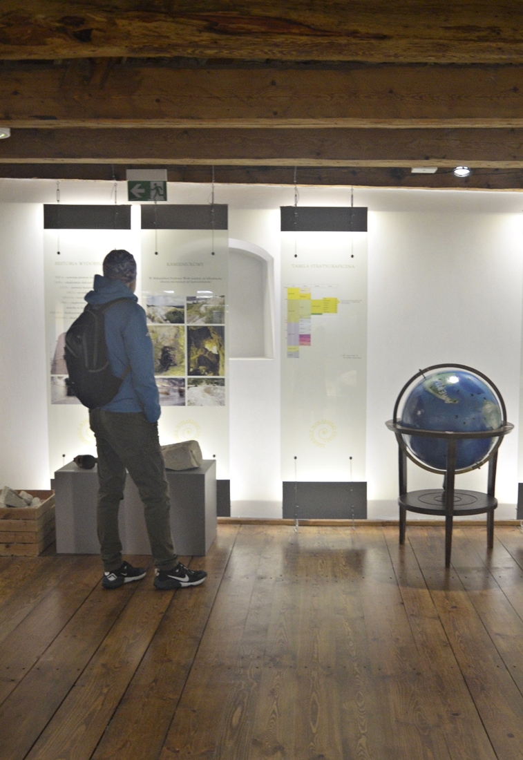 Ekspozycje skupiają się na przyrodzie Kazimierskiego Parku Krajobrazowego – wystawy prezentują historię powstawania wąwozów lessowych i skał wapiennych, a także miejscową florę i faunę. Dużą ciekawostką są skamieniałe szczątki zwierząt żyjących na terenie Kazimierza w okresie kredy, czyli ponad 65 milionów lat temu. Rejon ten był wtedy zalany ciepłym i płytkim morzem, w którym żyły między innymi amonity – takie ogromne morskie ślimaki:-). Zwierzęta te wyginęły wraz z końcem epoki kredy, więc skamieniałości są jedyną okazją, żeby wyobrazić sobie, jak wyglądały.