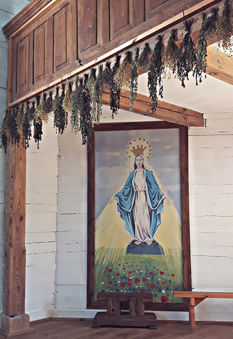 W znajdującym się w Korycinach Ziołowym Zakątku (skansen i gospodarstwo agroturystyczne w jednym) znajduje się urokliwy kościółek pod wezwaniem Matki Boskiej Jagodnej. Nigdy wcześniej nie widzieliśmy podobnego, niesłychanie rustykalnego wnętrza sakralnego:-).