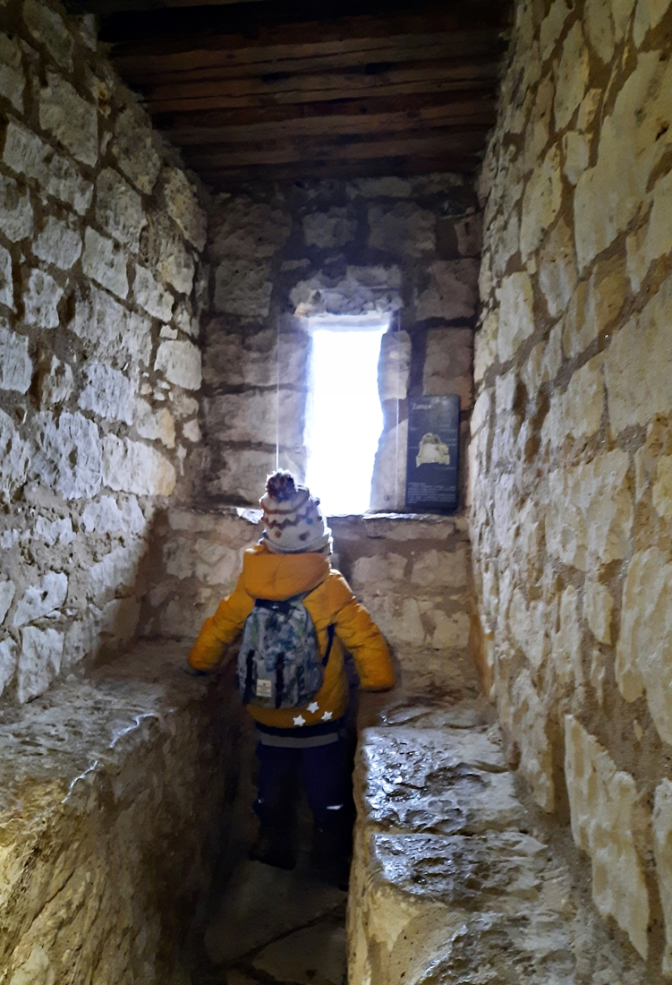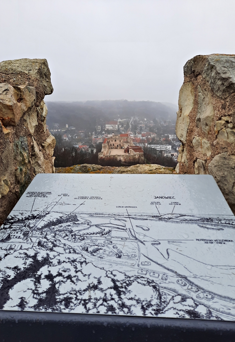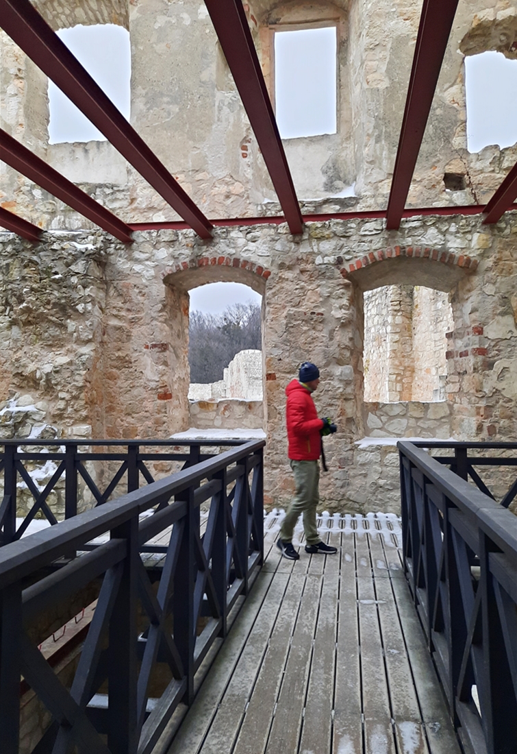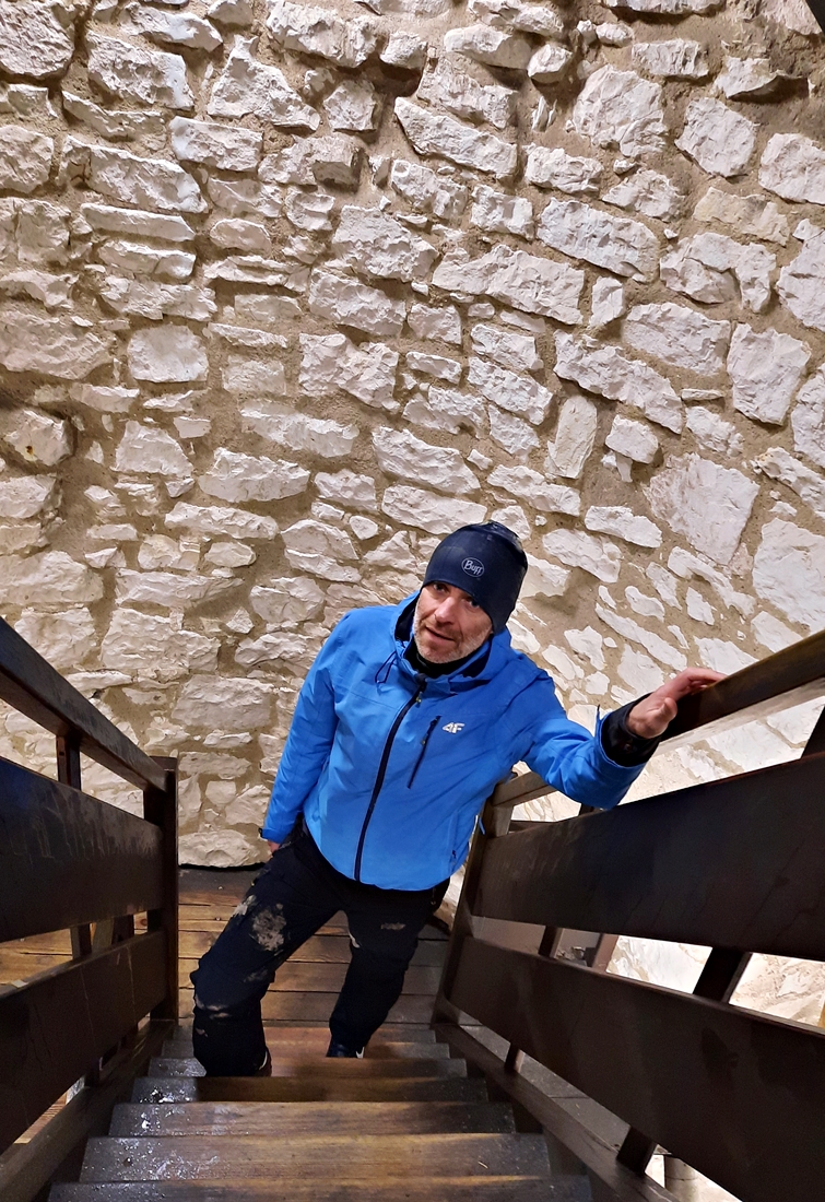 Wiało i padało. Było zimno, choć nie śnieżnie – taki to ostatni dzień roku 2021 przypadł nam w udziale;-). Schody na górę baszty były dosyć śliskie, więc poręcz okazała się niezbędna. Co ciekawe, grubość murów kazimierskiej wieży zmienia się wraz z jej wysokością – u podstawy to około czterech metrów, u szczytu już trzy.