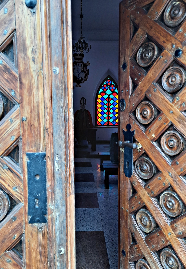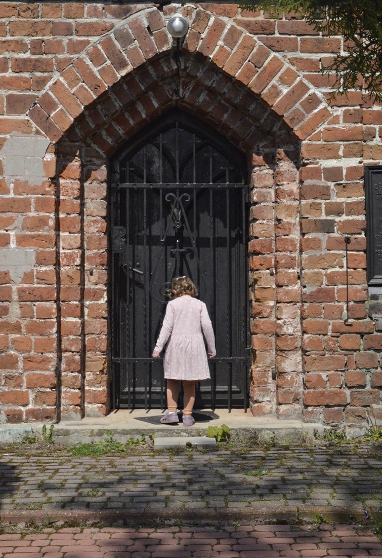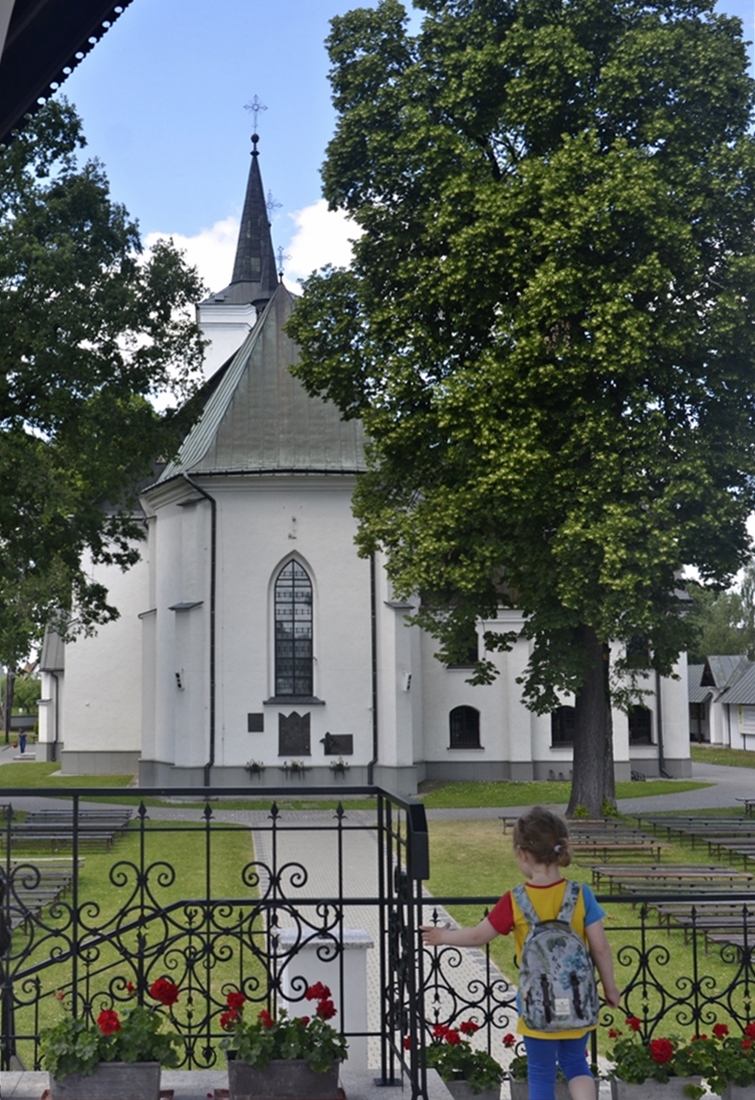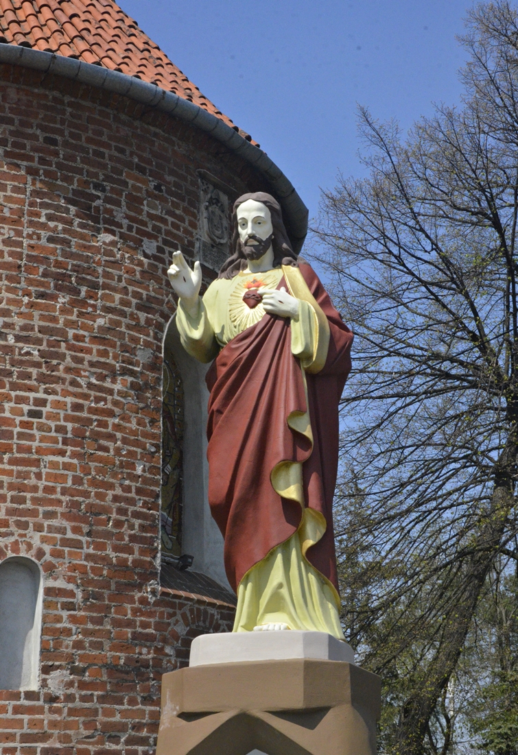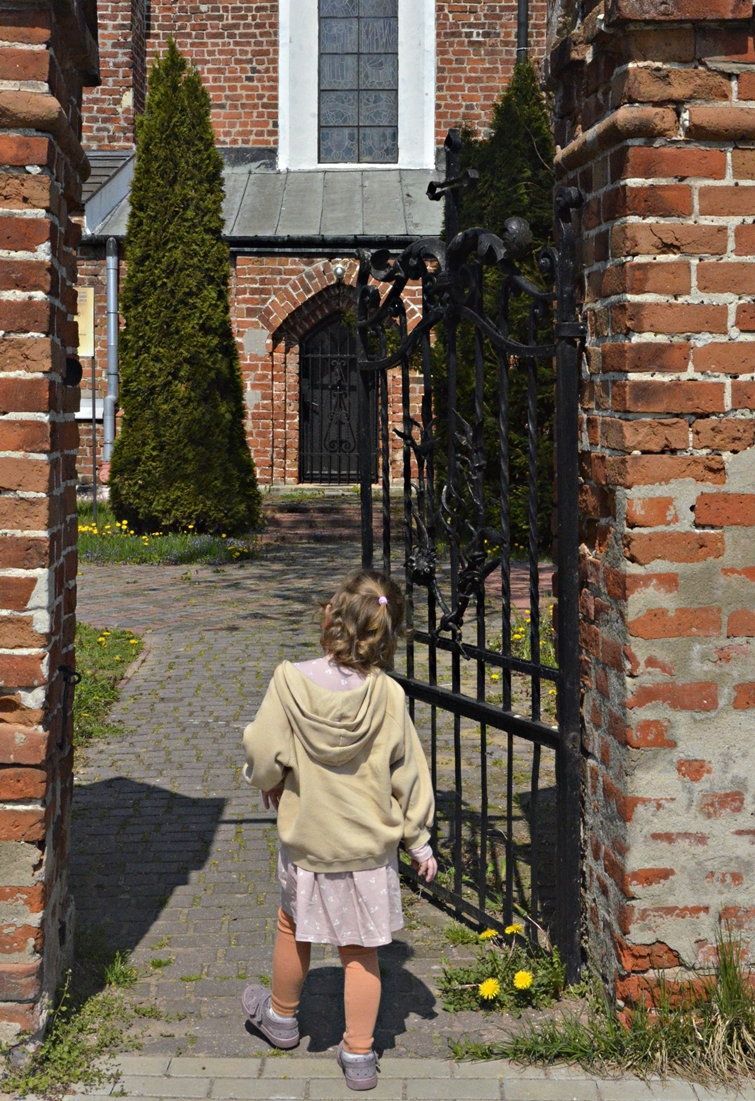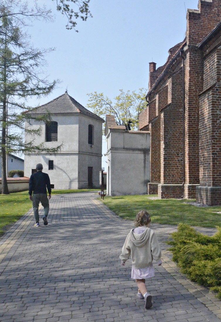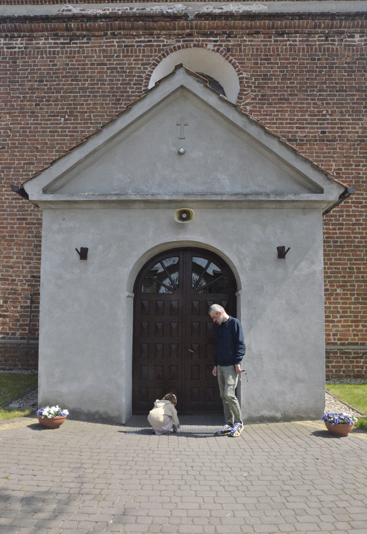 Samochód zatrzymaliśmy na malutkim parkingu obok budynków parafialnych. Pachniało wiosennymi kwiatami, a w trawach słychać było pierwsze chrabąszcze, muchy i pszczoły. W słońcu lśniła złota mozaika umieszczona w półkolistej absydzie kościoła. Wnętrza niestety nie udało nam się zobaczyć. W bramie, jak przystało na początek maja, powiewała biało-czerwona flaga.