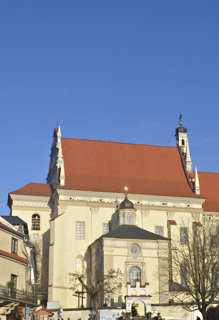 • KAZIMIERSKA FARA • Wokół małego placyku (…) tłoczą się drewniane domki, małe jak kurniki. Niespodziewanie nad nimi wystrzela biały masyw kościoła. Stoimy przytłoczeni tym widokiem jak pod ścianą kamieniołomu. To Fara. Wydaje się, że za chwilę spłynie na miasteczko z chmur jak okręt. Jest śliczna, pogodna, renesansowa (…). Zbigniew Herbert
