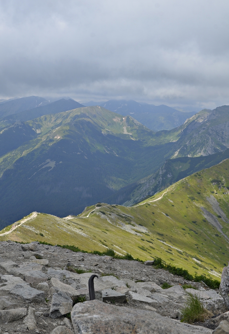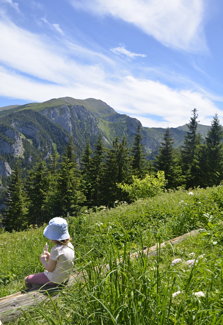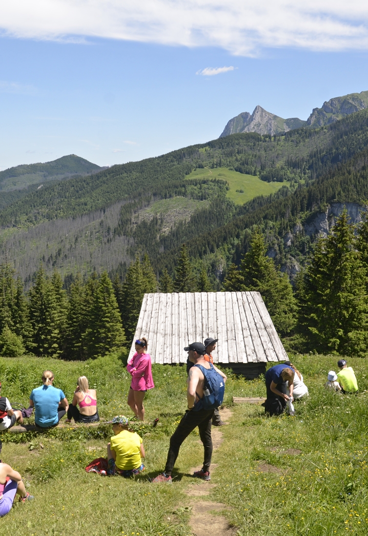 Usiedliśmy na jednej z ławeczek obserwując przepiękną panoramę roztaczającą się ze Stołów. Widać stąd m.in. Czerwone Wierchy i Giewont. Na polanie odpoczywała też grupa biegaczy – to popularna wśród nich tatrzańska trasa. W pewnym momencie, ku naszemu zdziwieniu, z lesistego zbocza powyżej szałasów wyłonili się panowie z panelami fotowoltaicznymi. Nie wnikaliśmy, skąd się tutaj wzięli, ale biegacze żartowali, że prędzej spodziewaliby się spotkać niedźwiedzia;-).