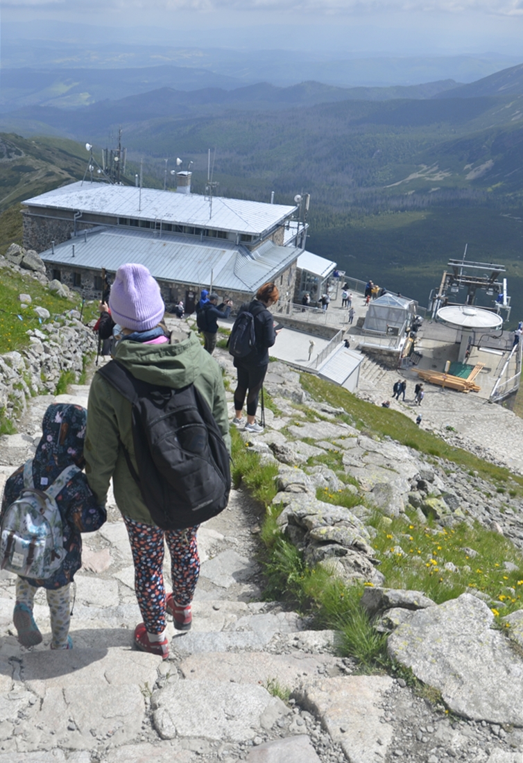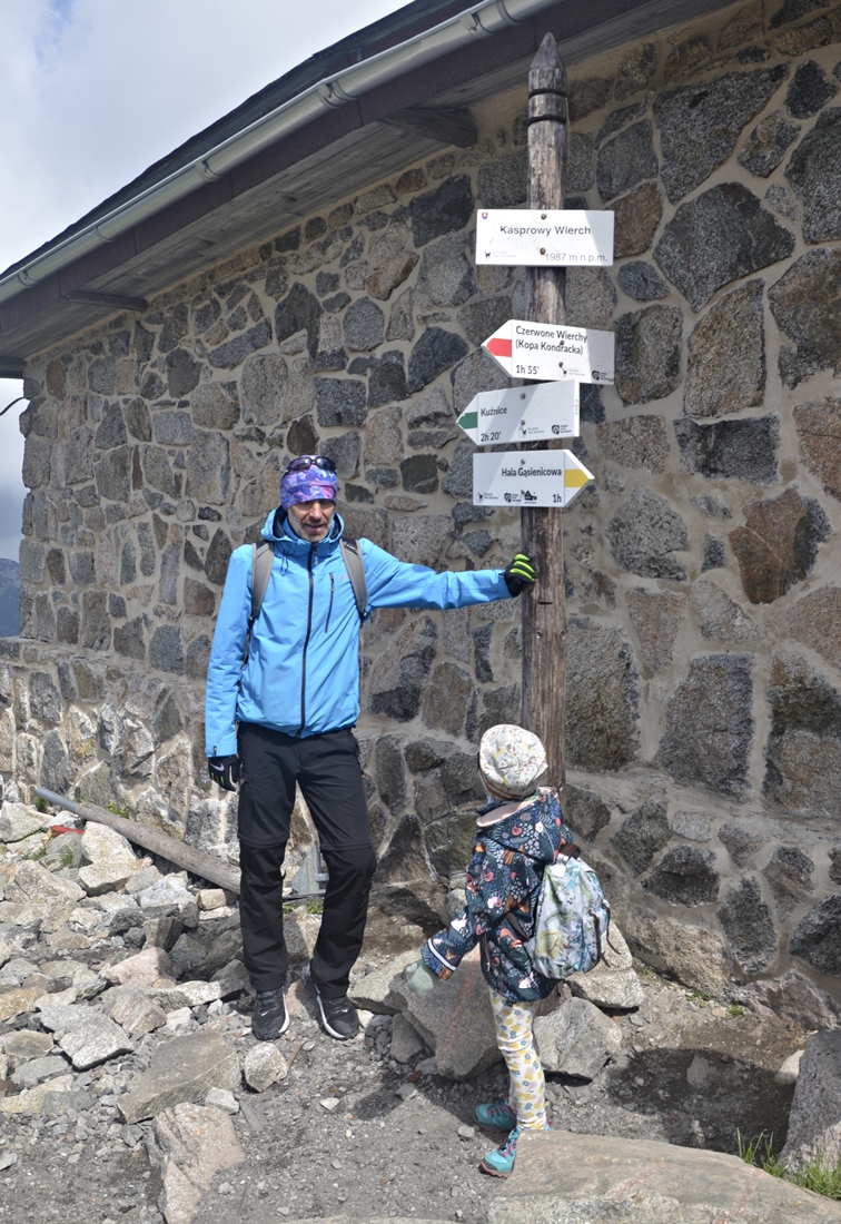 Na górę wjechaliśmy kolejką, zostawiając siłę nóg (zwłaszcza tych dziecięcych) na wędrówki w inne miejsca. Z górnej stacji mieliśmy do przejścia jeszcze kilka minut, by stanąć na szczycie Kasprowego. Znajduje się tam najwyżej położony budynek w Polsce – Wysokogórskie Obserwatorium Meteorologiczne. Na wierzchołku krzyżują się także piesze szlaki – zielony do Kuźnic, żółty na Halę Gąsienicową i czerwony w stronę Czerwonych Wierchów.