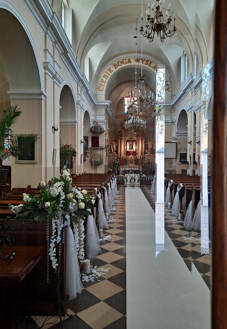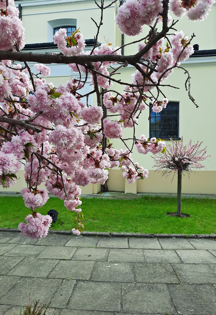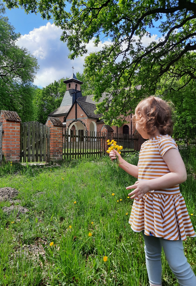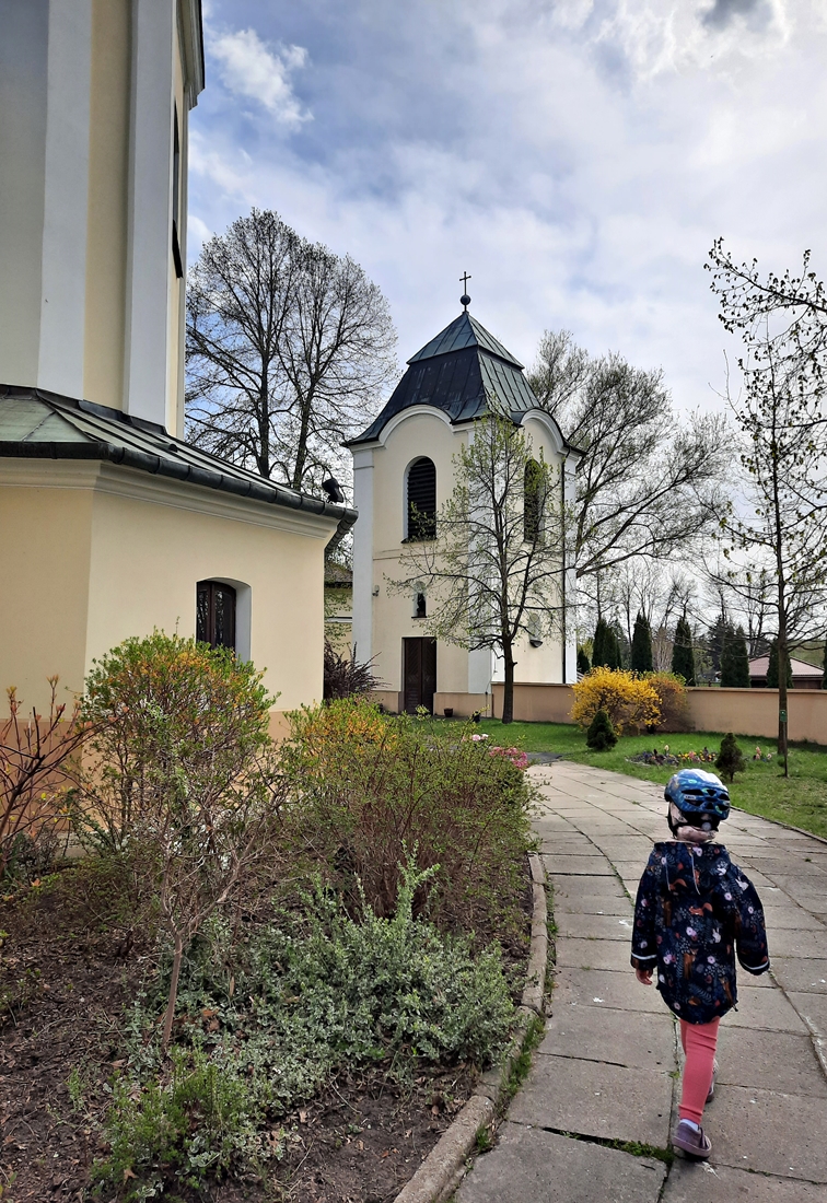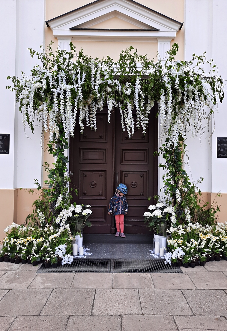 Powsin, część warszawskiego Wilanowa. Jedziemy rowerami, słyszymy bicie dzwonów. Dochodzą z miejscowego kościoła św. Elżbiety, będącego jednocześnie Sanktuarium Matki Bożej Tęskniącej. Na miejscu wita nas intensywny zapach kwiatów, jak na maj przystało:-).
