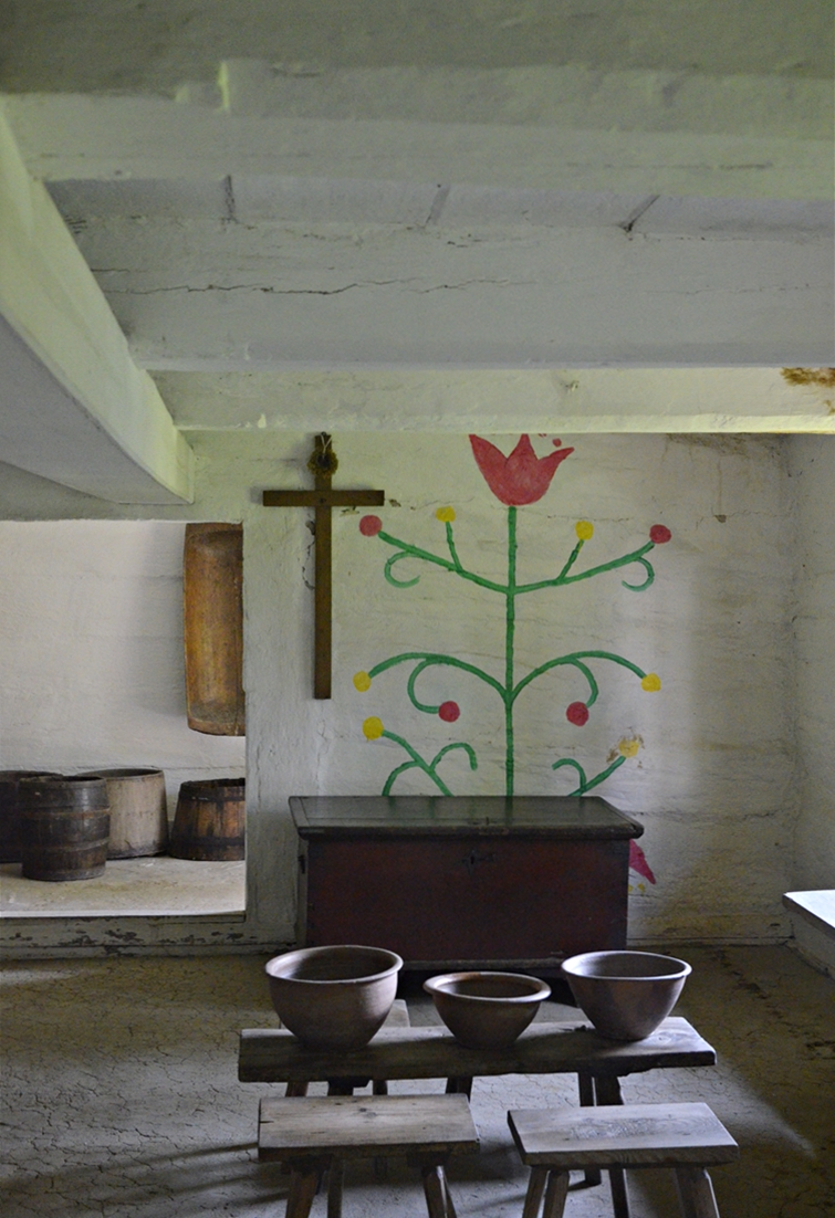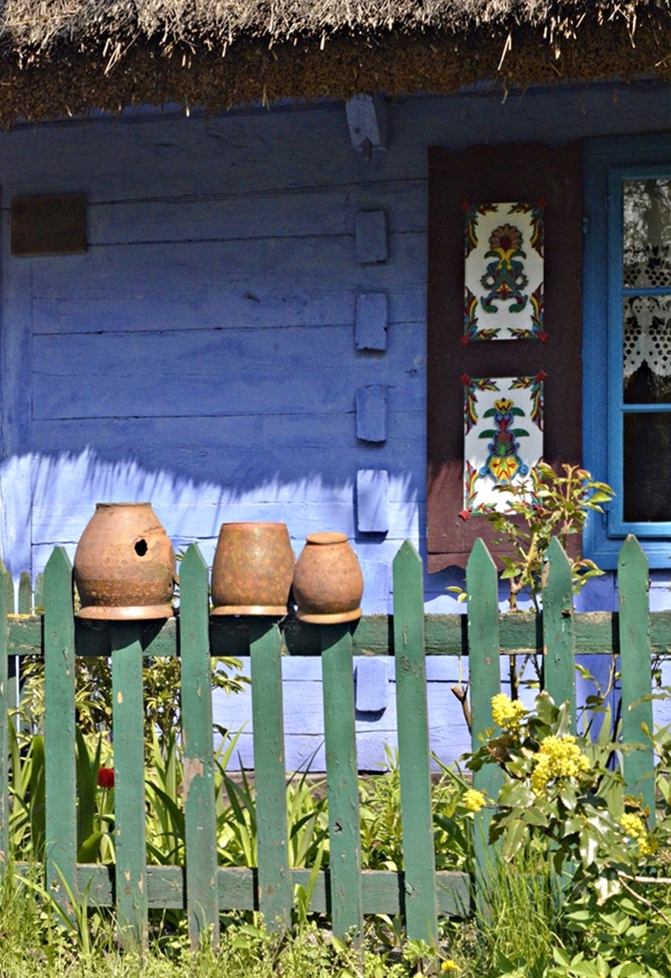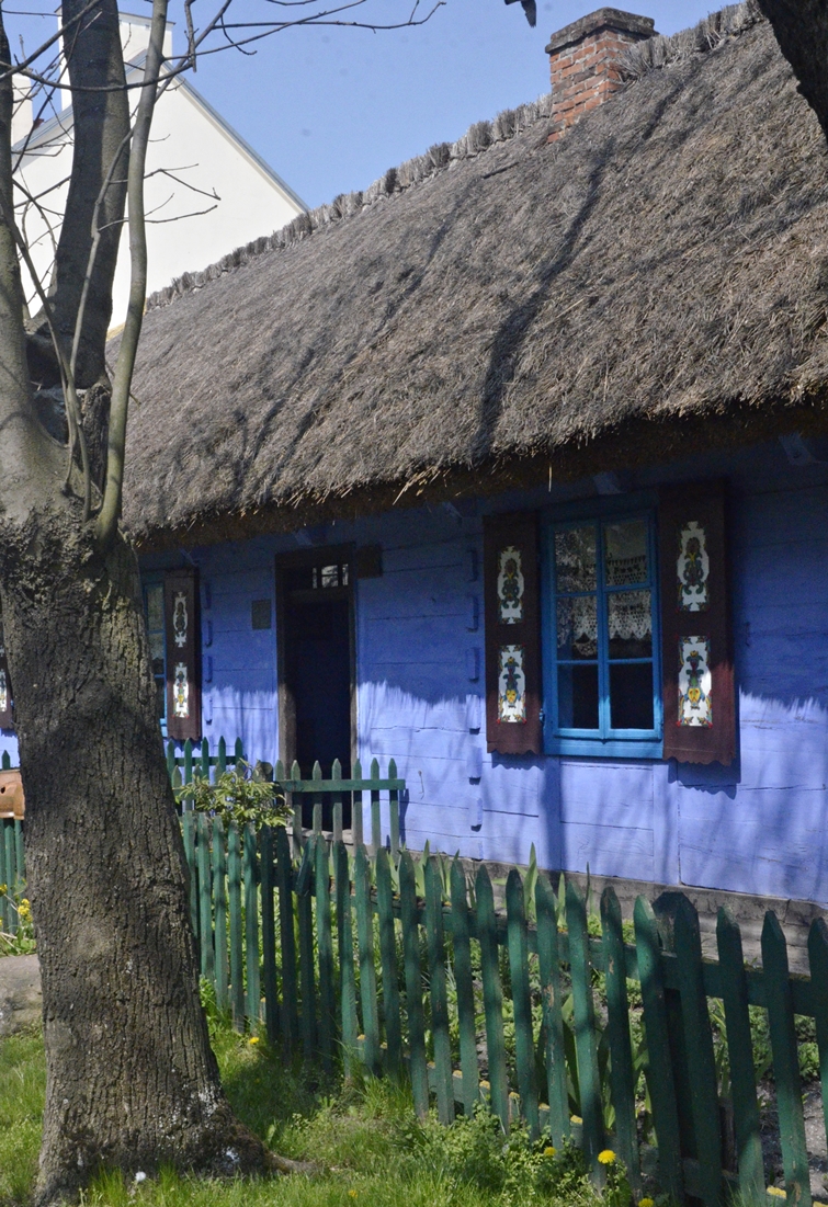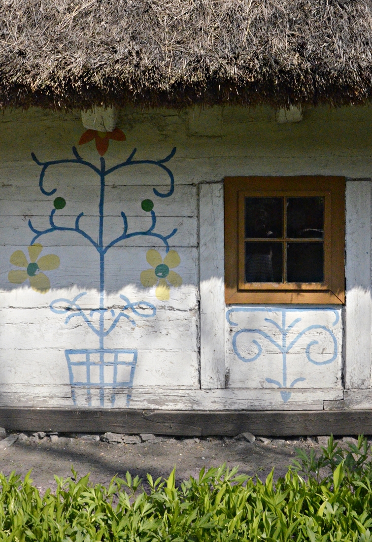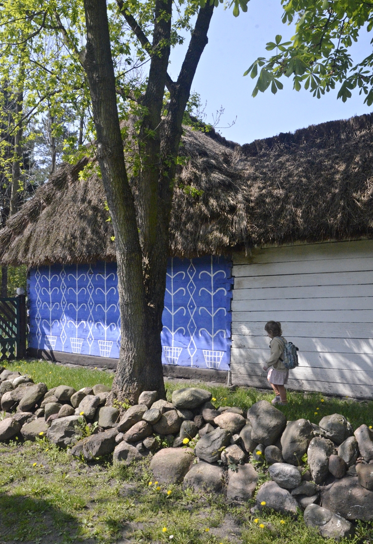 Miniskansen przy łowickim Muzeum powstał w latach 60. Tuż obok stoi blok, pewnie z czasów podobnych – miłe widoki z balkonów;-). Jedna z chałup pochodzi ze wsi Goleńsko, a datuje się ją na przełom 18 i 19 wieku. Niebieskie ściany, malowane kwiaty, zapach drewna – wszystko jak kiedyś. Na odtworzonym podwórku stoi też stodoła i spichlerz.