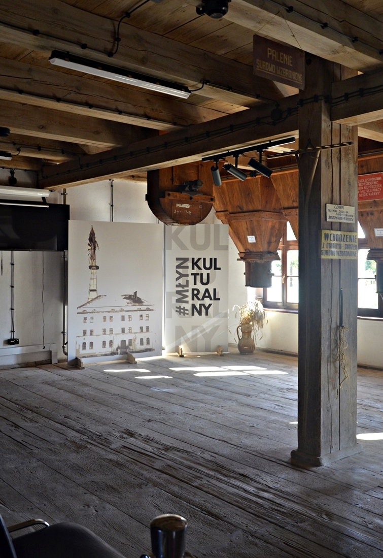 Rozglądamy się po wnętrzach. Jest cicho, pachnie drewnem, promienie słońca wpadają przez okna. Widzimy stare silosy na mąkę oraz inne urządzenia młyńskie pamiętające pruskie czasy. Oglądamy także zdjęcia misternie ułożone za gablotkami. Przedstawiają dawnych pracowników młyna i sam budynek, który dzięki rewitalizacji z 2022 roku nabrał nowego blasku.