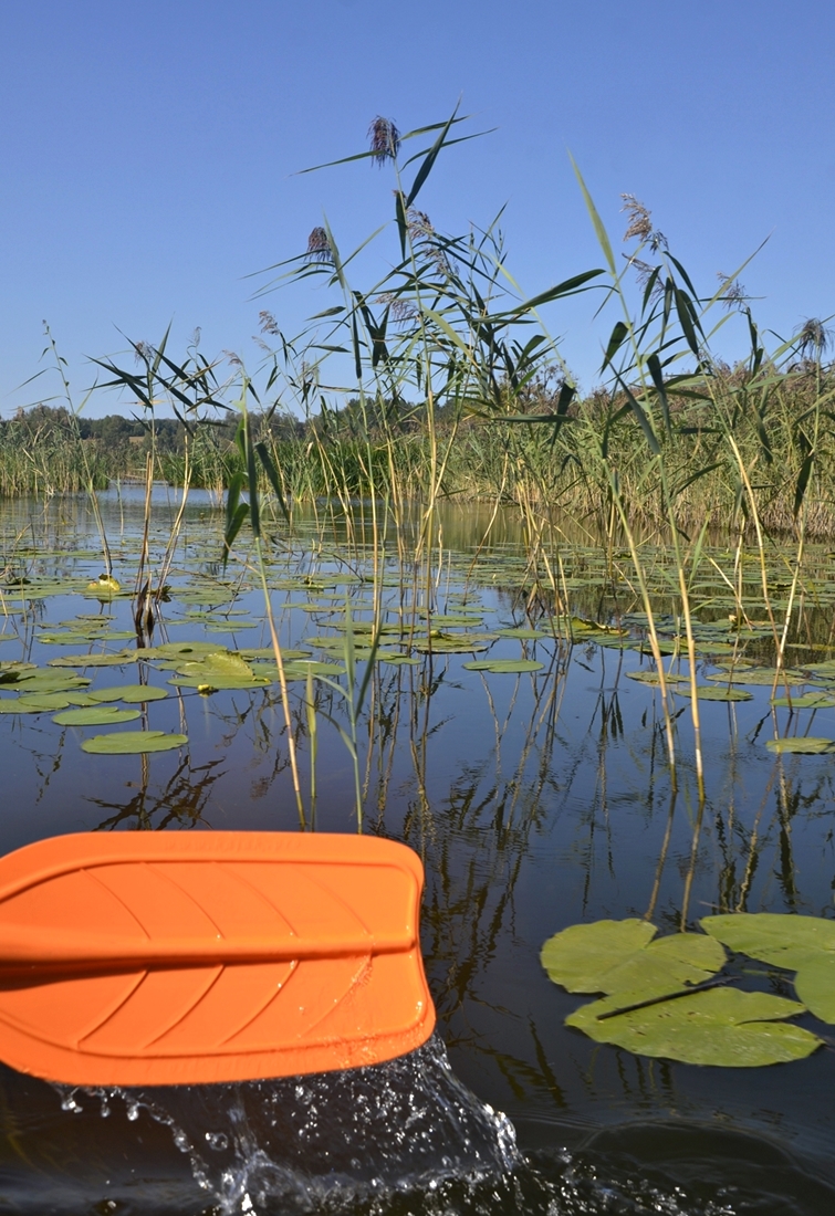 Sapina to urocza rzeka, która ma swój początek w Puszczy Boreckiej i wpada do jeziora Święcajty – jej długość to około 47 kilometrów. Nie jest głęboka, sięga zaledwie jednego metra. Pierwszy odcinek naszego spływu przebiegał po terenie zalesionym, następnie znaleźliśmy się na Jeziorze Wilkus połączonym wąskim trzcinowiskiem z Jeziorem Brząs. Cisza i spokój są tu niemal absolutne, co doceniają również wędkarze.